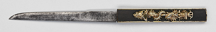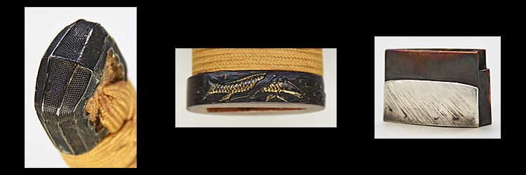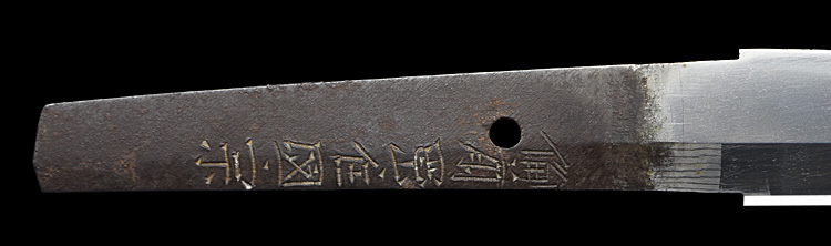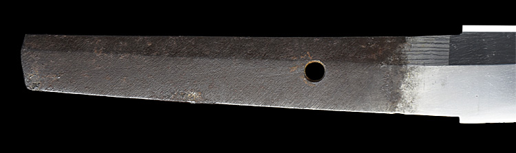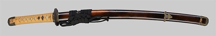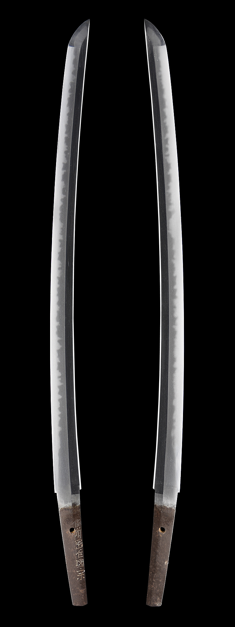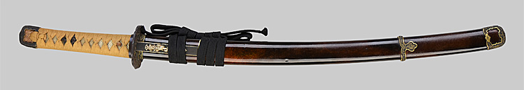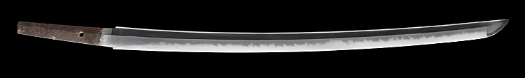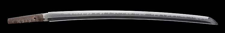 本造り庵棟 うぶ茎 小板目肌、柾交じりよく詰む。地沸微塵に厚くつき、細かな地景よく入り淡く映り立つ。刃紋は互の目丁字乱れ、尖り心の刃交じる。匂い口フックラと小沸よくつく。飛び焼きかかり、匂い足、葉盛んに働く。金筋、砂流しよくかかり匂口明るく冴える。茂右衛門。多門兵衛正成の子。備中にても打つ。良業物。焦茶色塗鞘脇差半太刀拵付き。(特別保存刀剣)