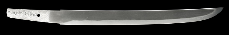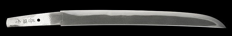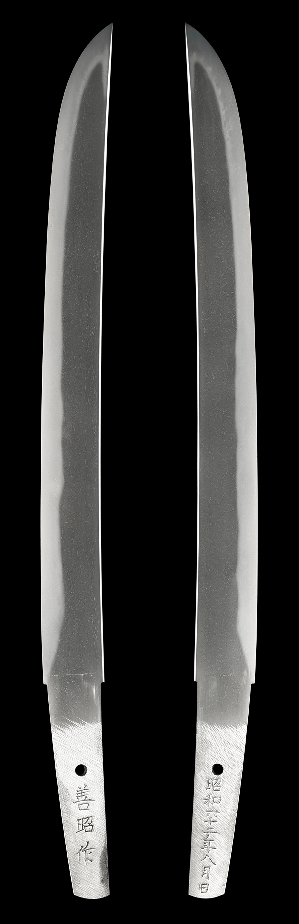 平造り庵棟 うぶ茎 板目肌、杢交じりよく練れ詰む。地沸微塵につき、地景よく入り、淡く映り立つ。刃紋は湾れに互の目、小丁字、尖り刃交じる。匂い口フックラと小沸よくつく。湯走り、飛び焼き盛んにかかり、小足、葉、よく働く。金筋、砂流し頻りにかかり、明るく冴える。本名は杉田昭二。川島忠善の門。備前一文字に私淑。ずぶ焼の名手。入賞多数。(保存刀剣)