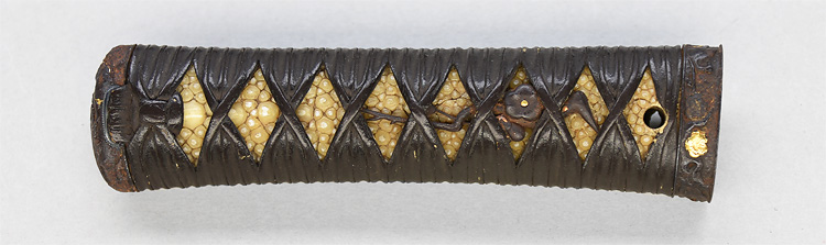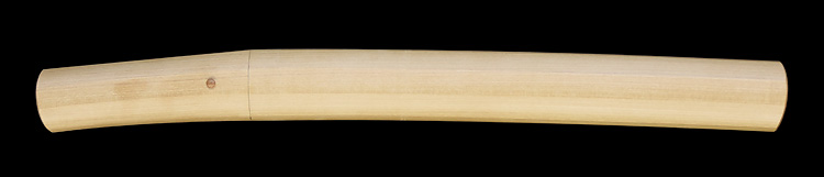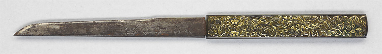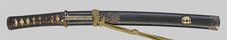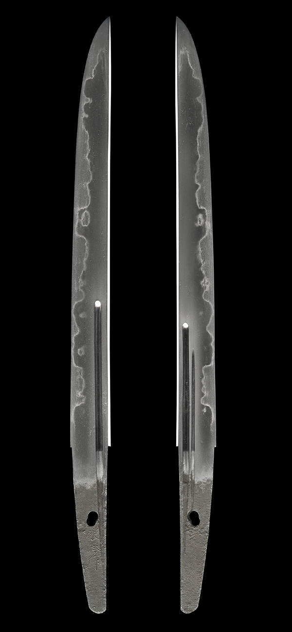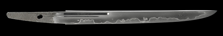 平造り三ツ棟 うぶ茎 小板目肌、杢交じりよく練れ詰む。地沸微塵に厚くつき、細かな地景よく入り淡く沸映り立つ。刃紋は湾れに互の目、丁字、尖り心の刃交じる。匂い口フックラと沸、小沸よくつく。湯走り、飛び焼かかり、足、葉盛んに働く。金筋、砂流し頻りにかかり、匂い口明るく冴える。小田原相州。本国島田。義助門人。北条氏康より康の字を賜る。黒皺石目塗鞘短刀拵え付き。(特別保存刀剣)