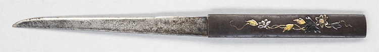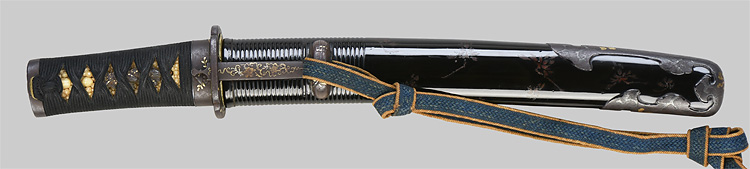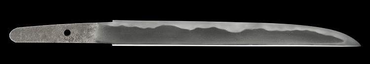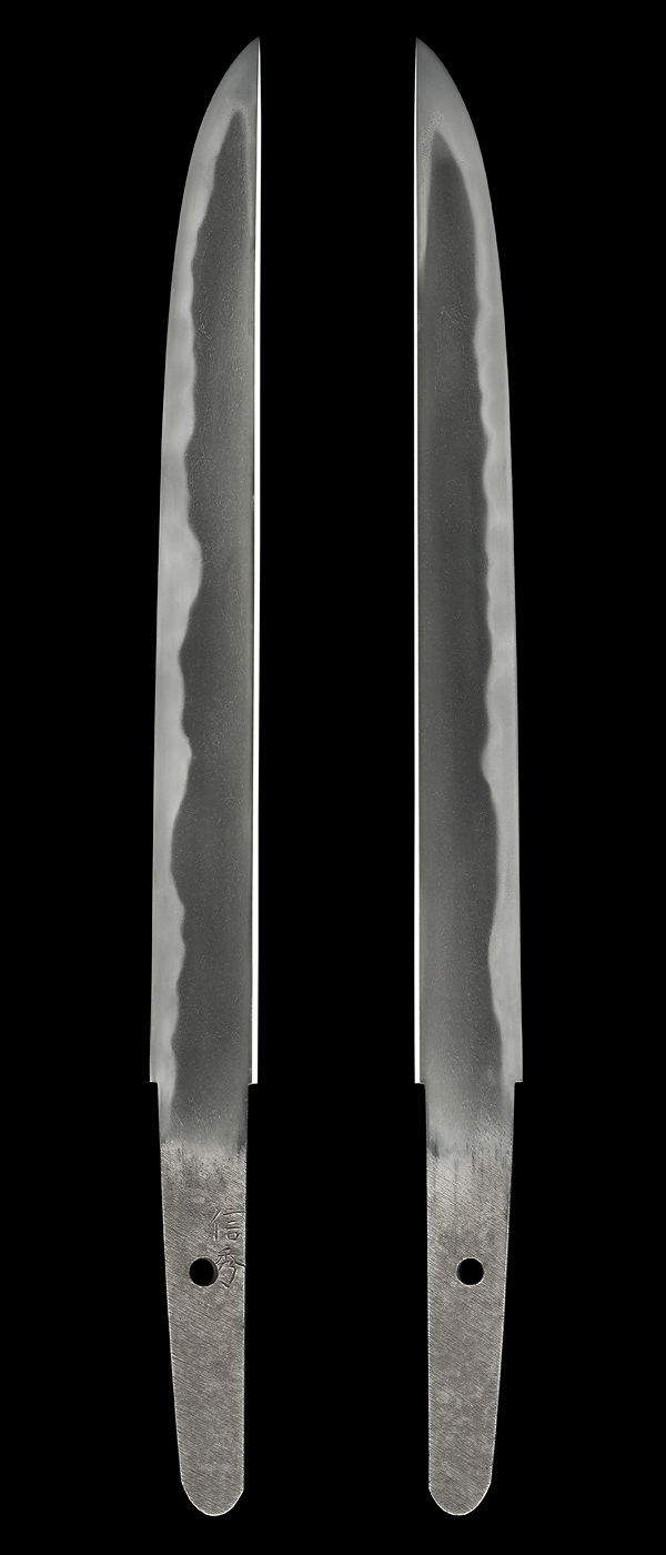 平造り庵棟 うぶ茎 板目肌、小板目交じりよく練れよく詰む。地沸微塵に厚くつき、細かな地景よく入り淡く沸映り立つ。刃紋は湾れに互の目、尖り心の刃交じる。匂い口フックラと沸、小沸よくつく。沸足、葉働き、金筋、砂流しよくかかる。匂い口明るく見事に冴える。本名は栗原健次。のち謙司。清磨門下屈指の名工。加納夏雄に彫金を学ぶ。鉄金具腰刻秋草蒔絵鞘小刀拵付き。拵も見事です。(特別保存刀剣)