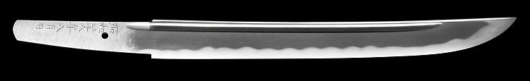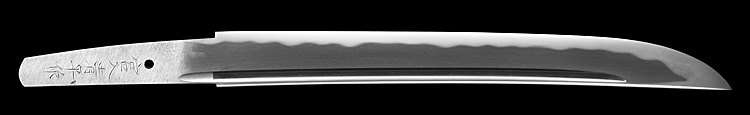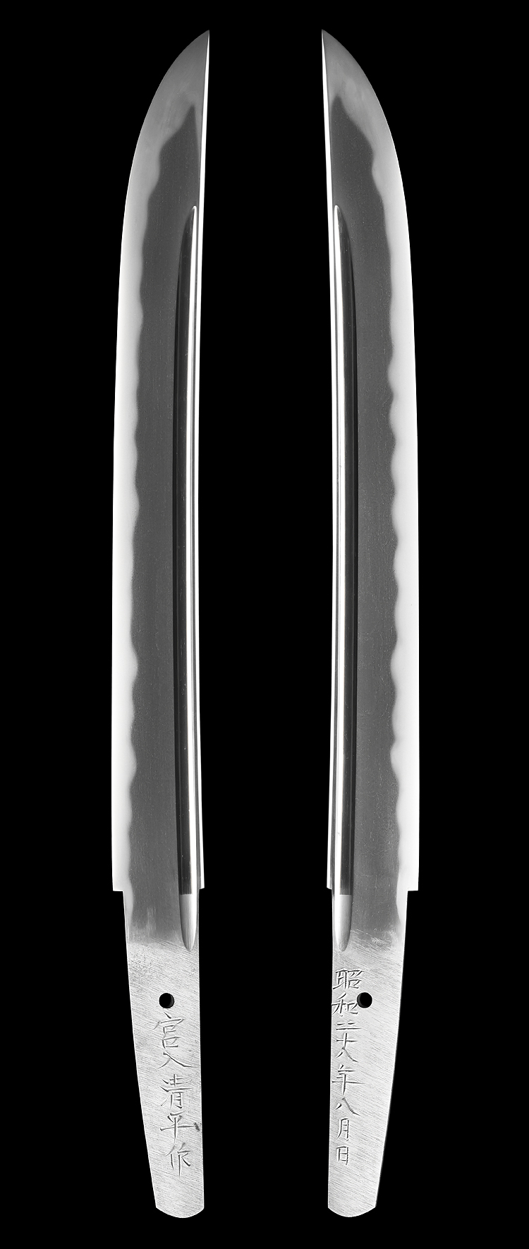 平造り庵棟 うぶ茎 小板目肌、杢交じりよく詰む。地沸微塵に厚くつき、細かな地景よく入り淡く沸映り立つ。刃紋は湾れに互の目交じる。匂い口フックラと小沸よくつく。匂い足、葉よく働く。金筋、砂流しよくかかり、匂い口明るく冴える。表裏に棒樋の彫刻。本名は宮入栄三。人間国宝宮入昭平の弟。坂城町住。