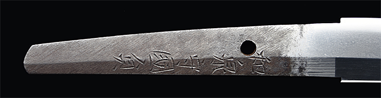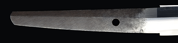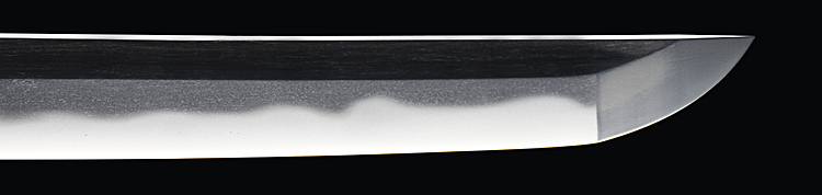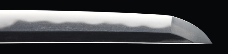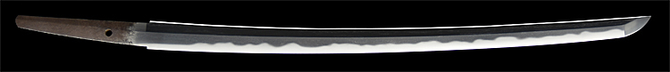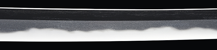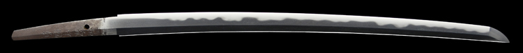 本造り庵棟 うぶ茎 小板目肌、杢交じりやや肌立ちよく練れよく詰む。地沸微塵に厚くつき、細かな地景よく入り、淡く沸映り立つ。刃紋は湾れに互の目、大互の目乱れる。匂い深く沸、小沸よくつく。匂い足、葉盛んに働き、金筋、砂流し頻りにかかる。匂い口明るく見事に冴える。井上八郎兵衛。初代和泉守國貞の次男。難波正宗いわれ助広と共に大阪新刀を代表する双璧である。新刀最上作。(特別保存刀剣)