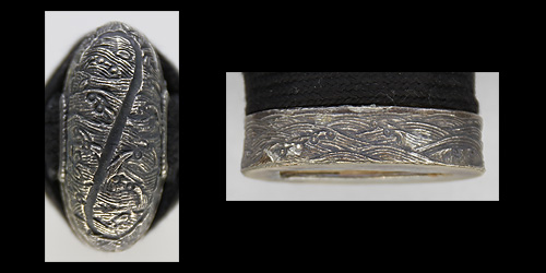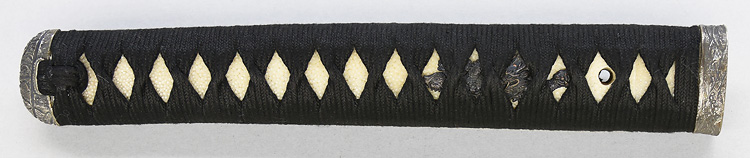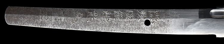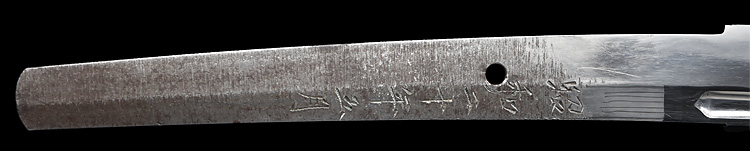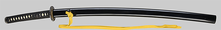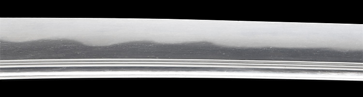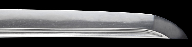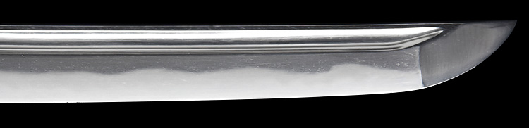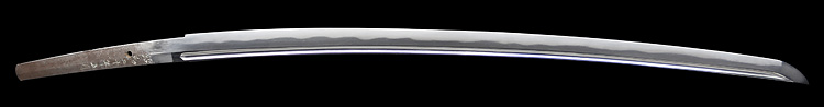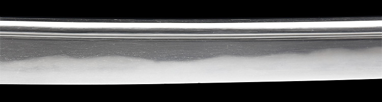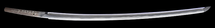 本造り庵棟 うぶ茎 小板目肌柾交じりよく詰む。地沸つき、細かな地景顕われ、淡く白気映り立つ。刃紋は湾れに互の目、丁字、尖り刃交じる。匂い口深めに沸、小沸よくつく。湯走りかかり足、葉盛んに働く。金筋、砂流しかかり明るく冴える。表裏に棒樋の彫刻。本名は原寛。元陸軍受命刀匠。陸軍軍刀技術奨励会会長賞。國工院会員名誉宗匠。原角太郎(初代沖光)の門。黒呂塗鞘打刀拵入り。