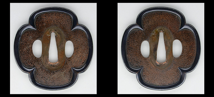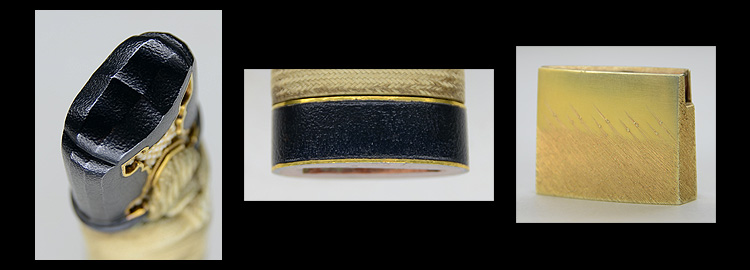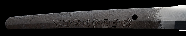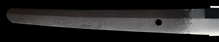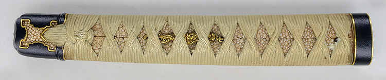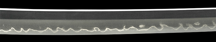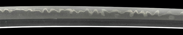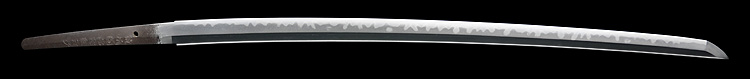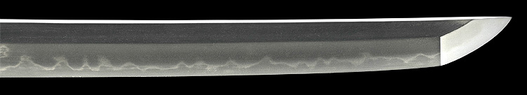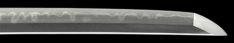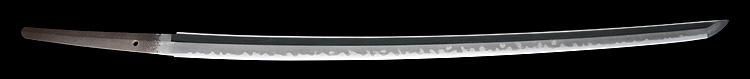 本造り庵棟 うぶ茎 板目肌、柾がかりよく詰む。地沸微塵に厚くつき、細かな地景顕われ淡く映り立つ。刃紋は互の目丁字乱れ、尖り心の刃交じり焼き高く華やか。匂い口フックラと小沸よくつく。湯走り飛び焼きかかり、足葉働く。金筋、砂流しかかり、匂い口明るく見事に冴える。福岡石堂、利平の子。黒田藩工。利休色漆霰文塗鞘半太刀拵付き。(特別保存刀剣、特別保存刀装具)