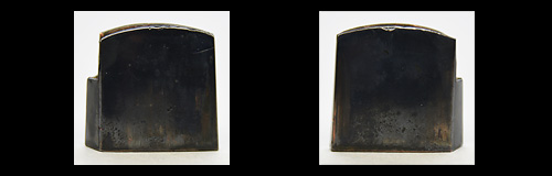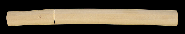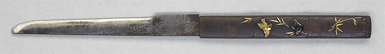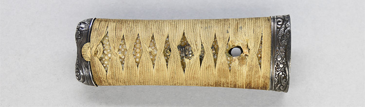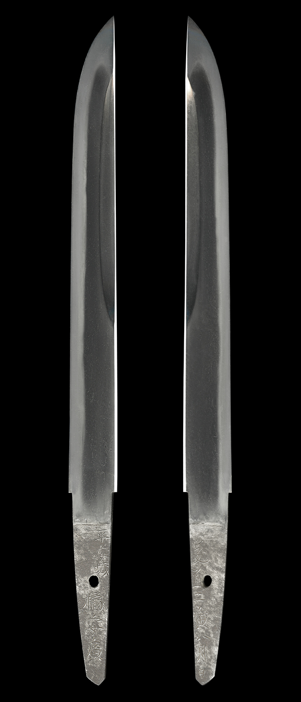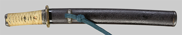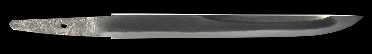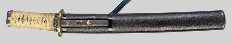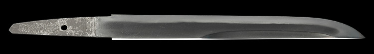 冠落し造り庵棟 うぶ茎 小板目肌、杢交じりよく練れ詰む。地沸微塵に厚くつき、細かな地景よく入り、淡く沸映り立つ。刃紋は広直刃、浅く湾れて小乱れ交じる。匂い口フックラと沸、小沸よくつく。刃縁ほつれ、僅かに小足、葉働く。金筋、砂流しかかり匂い口明るく冴える。黒石目模様塗鞘小方拵付き。(特別保存刀剣)