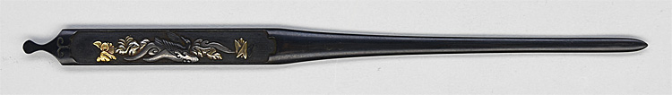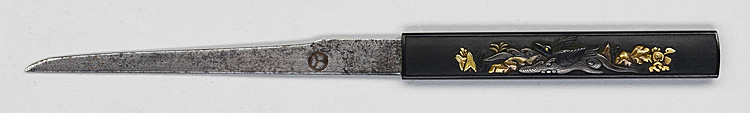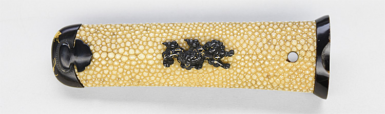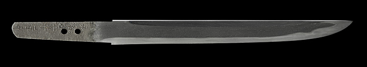 冠落し造り庵棟 うぶ茎 板目肌、杢交じりよく練れ詰む。地沸微塵に厚くつき、細かな地景よく入り、淡く沸映り立つ。刃紋は中直刃浅く湾れて小乱れ交じる。匂い口フックラと小沸よくつく。湯走りかかり、僅かに小足、葉働く。刃縁に細かな金筋よく絡み、砂流しかかり、明るく冴える。本作は孫右衛門と思われます。業物。末備前。出鮫暗朱黒模様塗鞘合口拵付き。(特別保存刀剣)