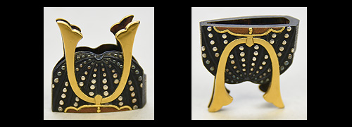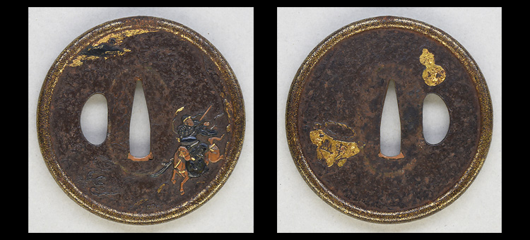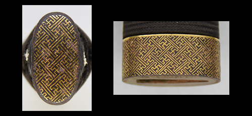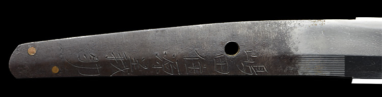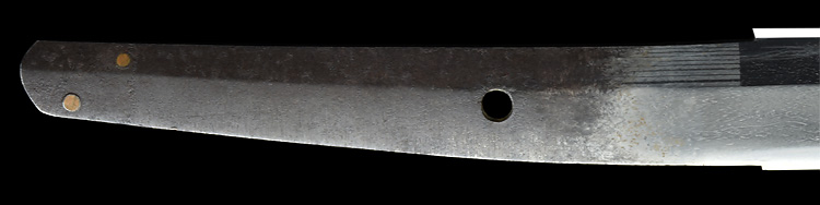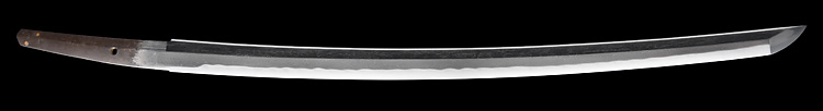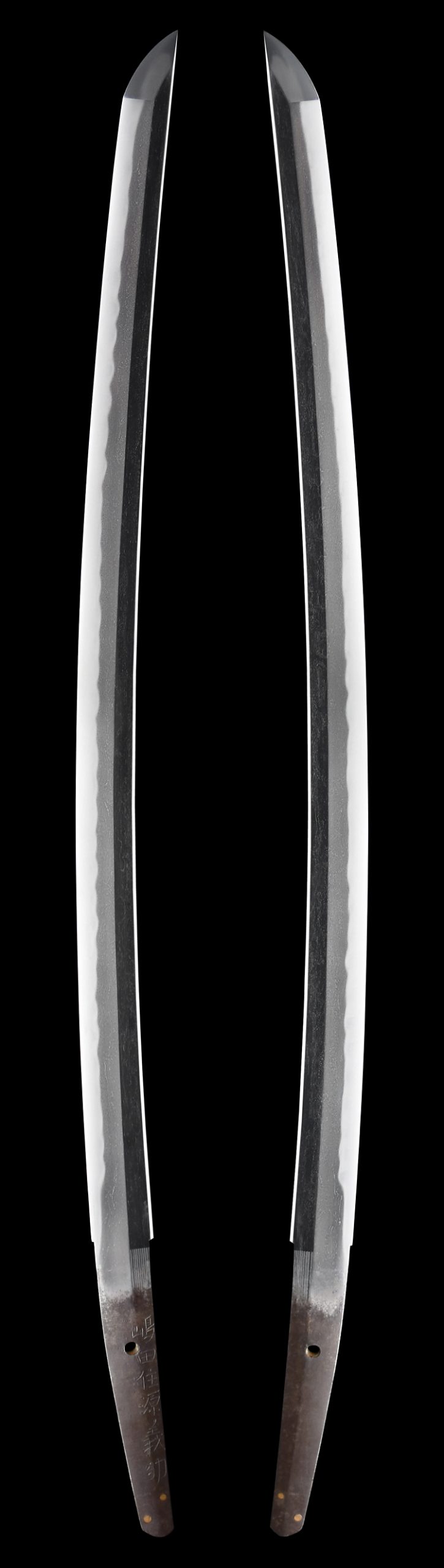 本造り庵棟 うぶ茎 板目肌、杢交じりややザングリと肌立ちよく練れ詰む。地沸微塵に厚くつき、細かな地景顕われ淡く沸映り立つ。刃紋は互の目乱れ、尖り心の刃交じる。匂い口フックラと小沸よくつく。匂い足、葉働き、金筋、砂流しかかる。匂い口明るく冴える。島田鍛冶五代目。本名は五条清兵衛。法名宗紅。駿河の名門鍛冶。大井川の大水害により元島田に移り、のち島田宿に住む。甲州にても打つ。黒呂印籠刻鞘脇差拵付き。(特別保存刀剣)
