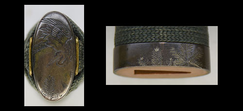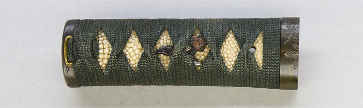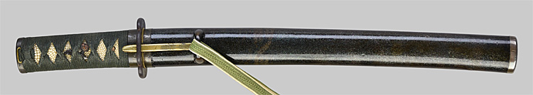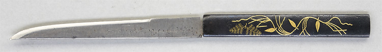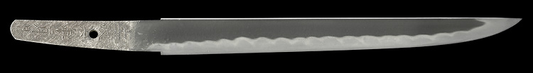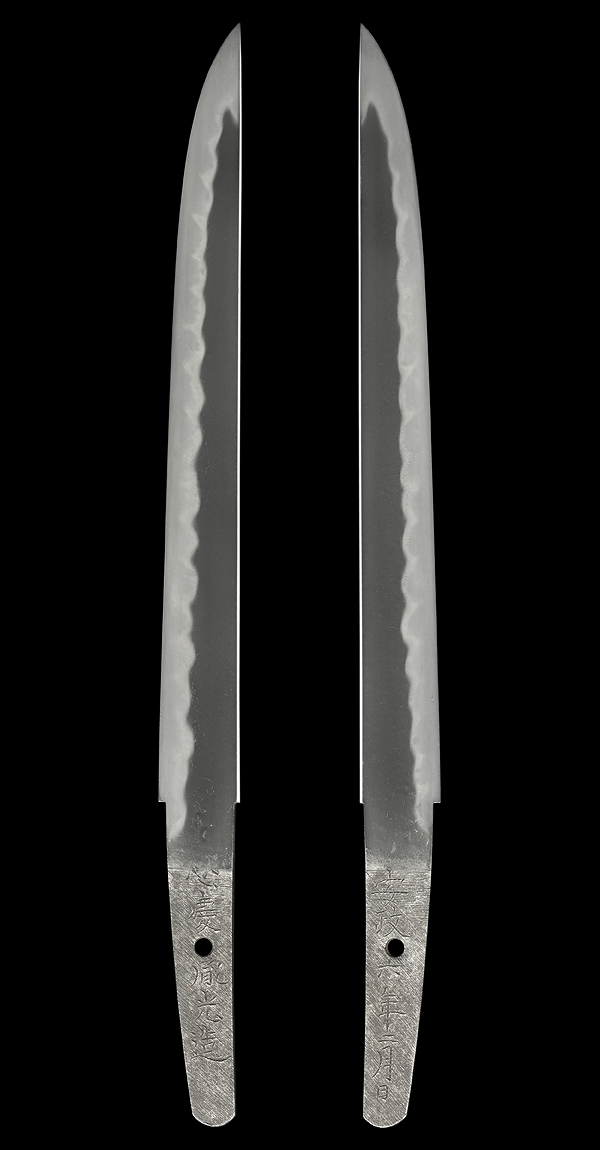 平造り庵棟 うぶ茎 板目肌、柾交じりよく詰む。地沸微塵に厚くつき、細かな地景顕われ、淡く沸映り立つ。刃紋は互の目乱れ、匂い口フックラと小沸よくつく。匂い足、葉働き、金筋、砂流しかかる。匂い口明るく冴える。本名は長尾栄吉。大慶直胤門人。心慶と号す。長尾包定家を再興し名跡をつぐ。土浦藩工。青貝微塵塗鞘短刀拵付き。(特別保存刀剣)