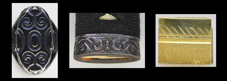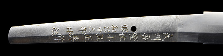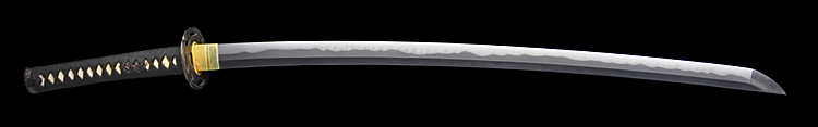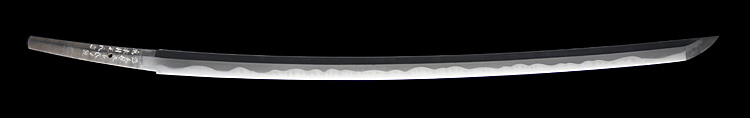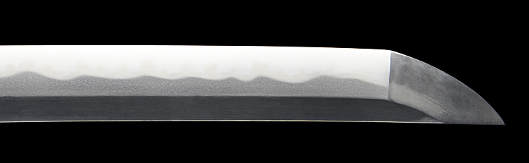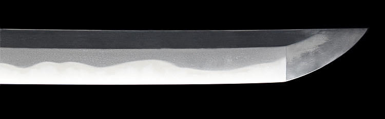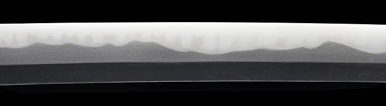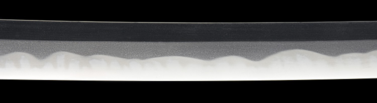 本造り庵棟 うぶ茎 小板目肌、杢交じりややザングリと肌立ちよく詰む。地沸微塵に厚くつき、細かな地景よく入り淡く沸映り立つ。刃紋は湾れに互の目、丁字、尖り心の刃交じる。匂い口やや深めに沸、小沸よくつく。湯走りかかり、匂い足、葉盛んに働く。金筋、砂流し頻りにかかり、匂い口やや沈み心に明るく冴える。小沢岩造。宮口寿広、塚本起正の門。入賞多数。身巾広く豪壮。黒呂塗鞘打刀拵付き。