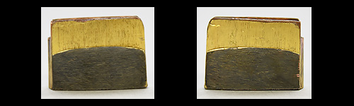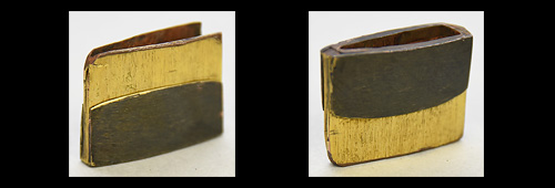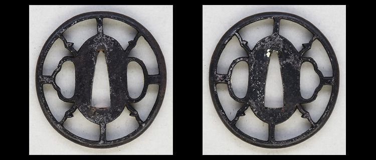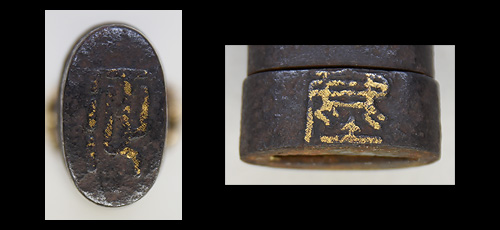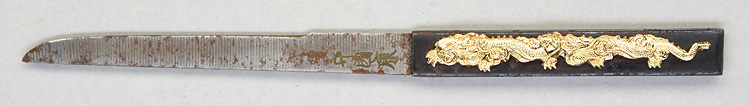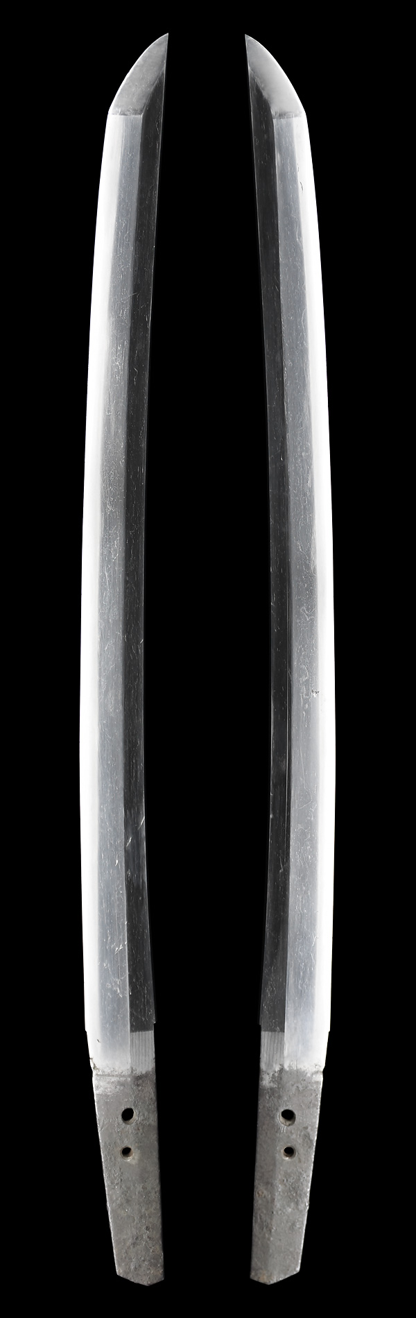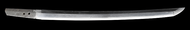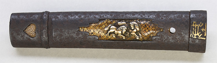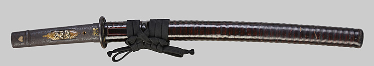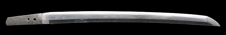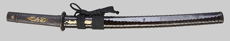 本造り庵棟 うぶ茎 板目肌、柾交じりやや大肌顕わる。地沸つき、細かな地景顕われ、淡く白気映り立つ。刃紋は中直刃、浅く湾れて小乱れ交じる。匂い口ややフックラと小沸つく。刃縁ほつれ、僅かに小足、葉働く。金筋、砂流しかかり明るく冴える.是一の門。加賀。鉄金具印籠刻鞘脇差拵入り。