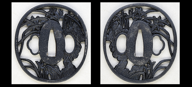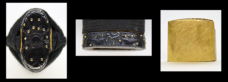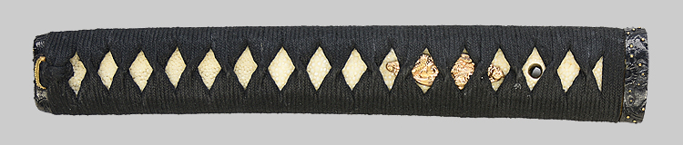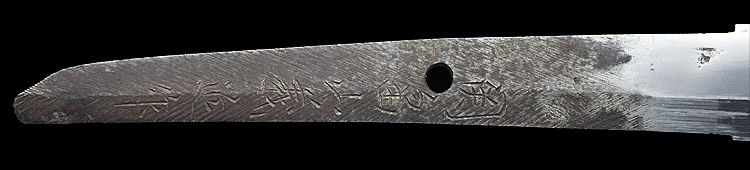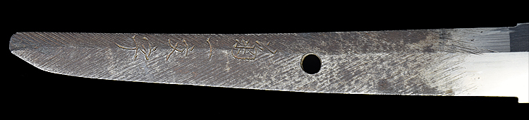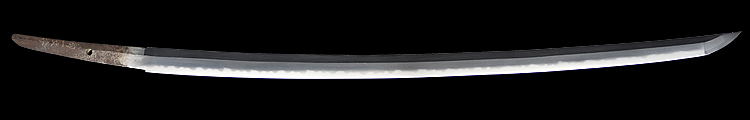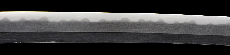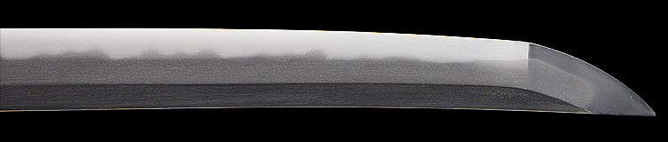 本造り庵棟 うぶ茎 小板目肌、柾交じりよく詰む。地沸微塵につき、細かな地景顕われ淡く沸映り立つ。刃紋は湾れに互の目、丁字、尖り刃交じる。匂い口フックラと小沸よくつく。匂い足、葉働き、金筋、砂流しかかる。匂い口明るく冴える。茎の佩裏に菊一文字と切る。関の軍刀鍛冶。戦後の作刀を見ない。黒呂塗鞘打刀拵入り。