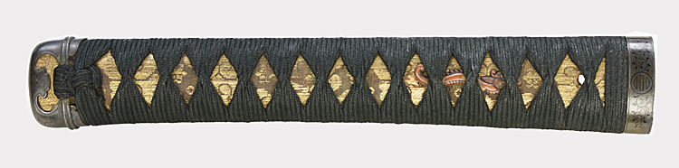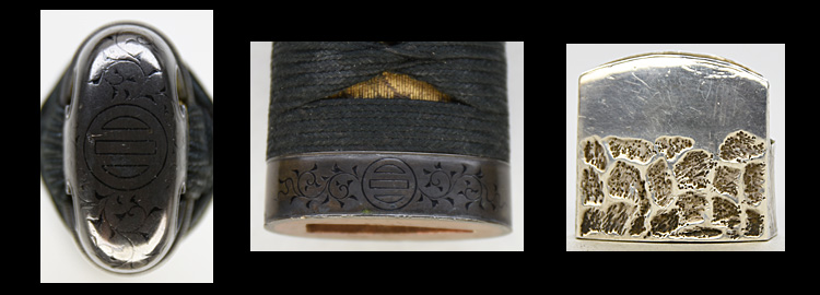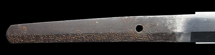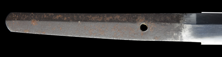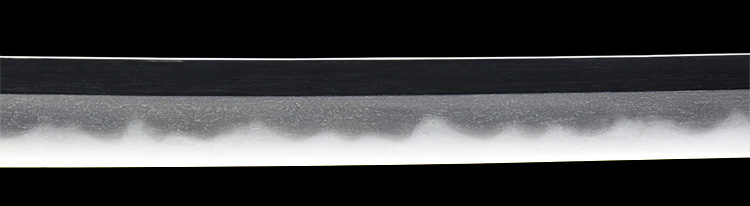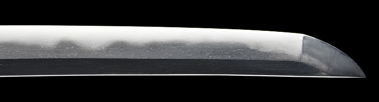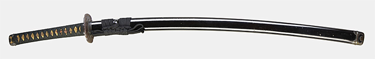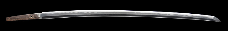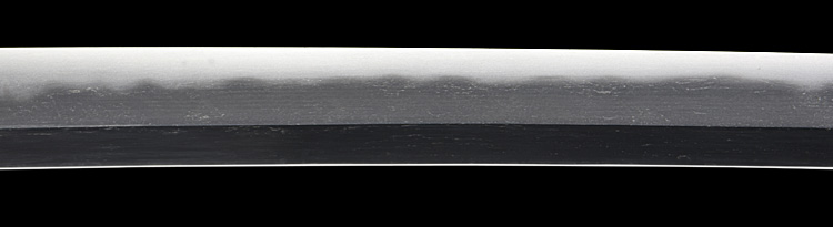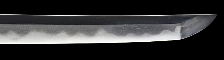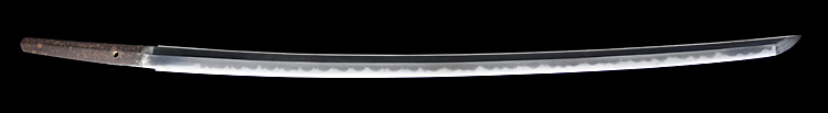 本造り庵棟 うぶ茎 板目肌、柾交じりよく詰む。地沸微塵に厚くつき、細かな地景よく入り淡く乱れ映り立つ。刃紋は腰の開いた互の目に丁字、尖り心の刃交じる。匂い口締まり心に小沸よくつく。湯走りかかり、小足、葉働く。金筋、砂流しかかり、匂い口明るく冴える表裏に棒樋の彫刻。宗左衛門尉の俗銘は、室町末期の元亀頃とされており作品少なく珍しい。さすがに出来が良い。黒呂塗鞘打刀拵付き。(特別保存刀剣)