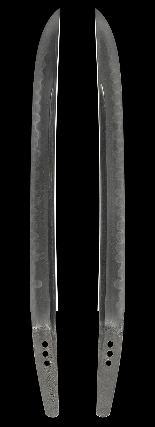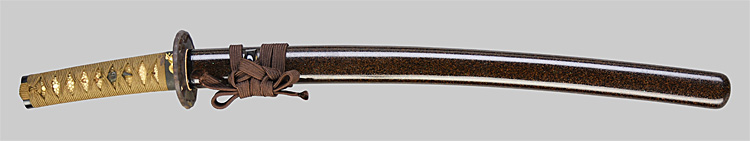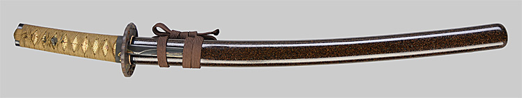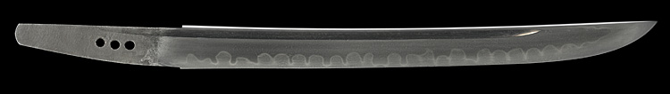 平造り庵棟 うぶ茎 板目肌、杢交じりややザングリと肌立ちよく練れ詰む。地沸微塵に厚くつき、細かな地景顕われ、淡く映り立つ。刃紋は互の目、丁字乱れ(兼房丁字)。匂い口フックラと小沸よくつく。匂い足、葉よく働き頻りに金筋、砂流しかかる。匂い口明るく冴える。本名は京三郎のち清左衛門。関善定派、三代兼房(善斎)の三男。織田信長抱工。焦茶黒青貝散塗鞘脇差拵付。(特別保存刀剣)