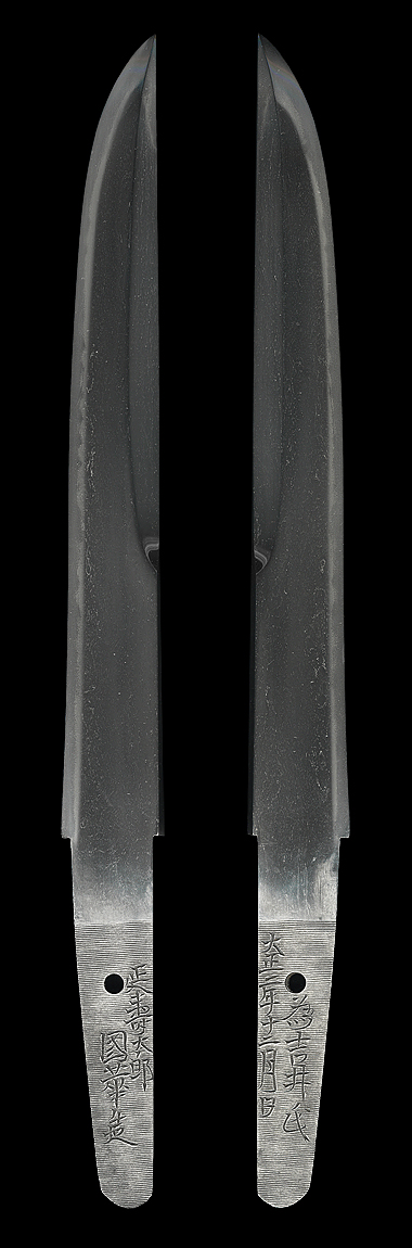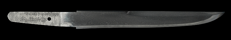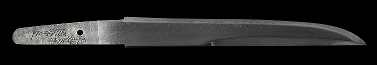 菖蒲造り庵棟 うぶ茎 板目肌、柾交じりよく詰む。地沸微塵につき、細かな地景顕われ、淡く白気映り立つ。刃紋は湾れに互の目、小互の目交じる。匂い口ややフックラと小沸つく。刃縁ほつれ、小足、葉働く。金筋、砂流しかかり明るく冴える。菊池延寿の末流。(保存刀剣)