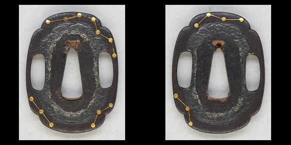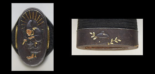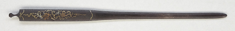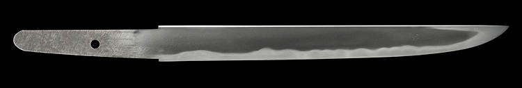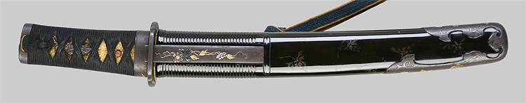 平造り庵棟 うぶ茎 板目肌、小板目交じりよく練れよく詰む。地沸微塵に厚くつき、細かな地景よく入り淡く沸映り立つ。刃紋は湾れに互の目、尖り心の刃交じる。匂い口フックラと沸、小沸よくつく。沸足、葉働き、金筋、砂流しよくかかる。匂い口明るく見事に冴える。本名は栗原健次。のち謙司。清磨門下屈指の名工。加納夏雄に彫金を学ぶ。鉄金具腰刻秋草蒔絵鞘小刀拵付き。拵も見事です。(特別保存刀剣)