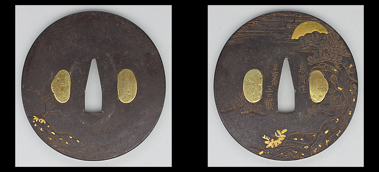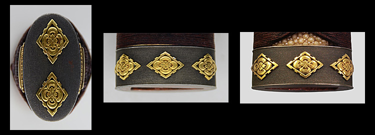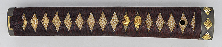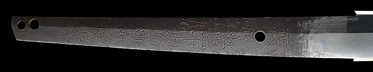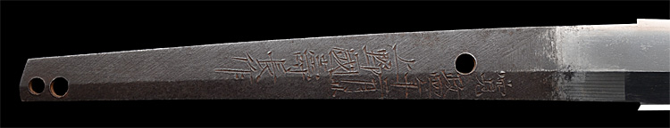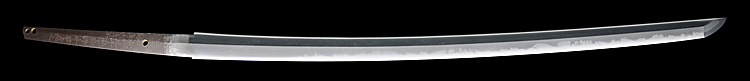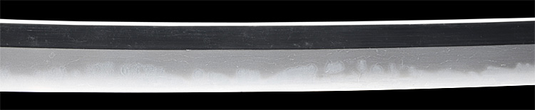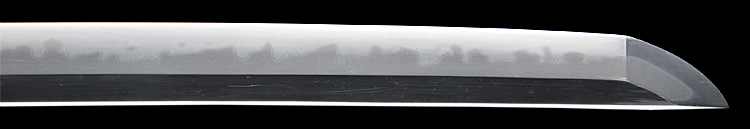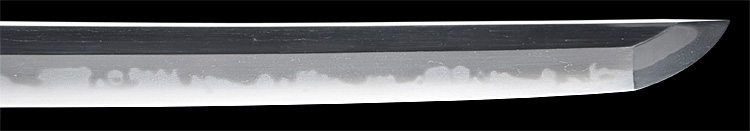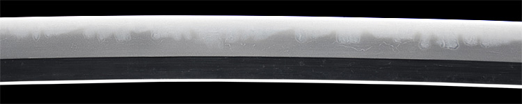 本造り庵棟 うぶ茎 板目肌、柾交じりよく詰む。地沸微塵に厚くつき、細かな地景よく入り淡く映り立つ。刃紋は湾れに互の目、丁字、尖り刃交じる。匂い口フックラと小沸よくつく。湯走りかかり、足、葉よく働く。金筋、砂流しよくかかり、匂い口明るく冴える。黒漆塗銀蛇籠文鞘大小拵付き。入れ子鞘。(特別保存刀剣、特別保存刀装具)