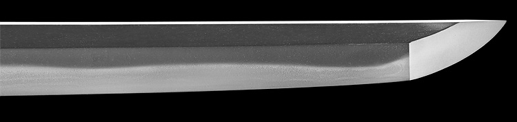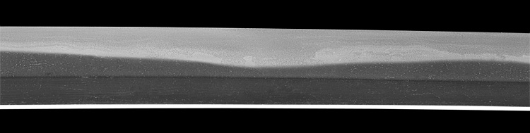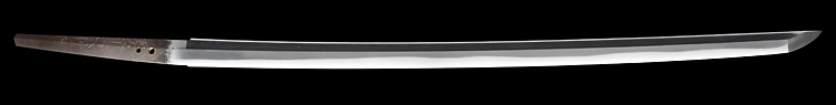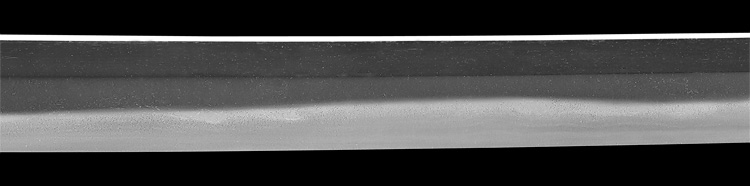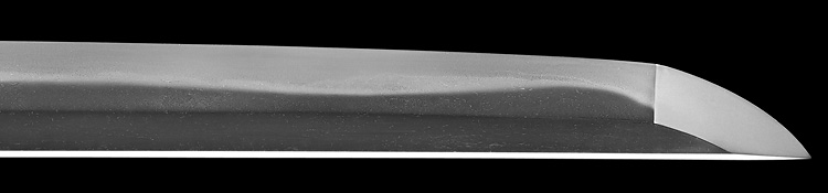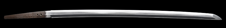 本造り庵棟 うぶ茎 小板目肌、杢交じりよく詰む。地沸微塵に厚くつき、細かな地景よく入り、沸映り立つ。刃紋は大湾れに互の目交じる。匂い口深めに沸、小沸よくつく。湯走り、二重刃かかり、僅かに沸足、葉働く。刃縁に金筋頻りにかかり、砂流しかかる。匂い口明るく見事に冴える。本名は津田甚之丞。角津田。ソボル助広門人、のち養子となる。井上真改と並んで大阪新刀の双璧をなす。大業物。(特別保存刀剣)