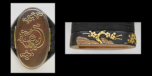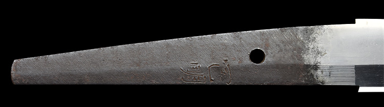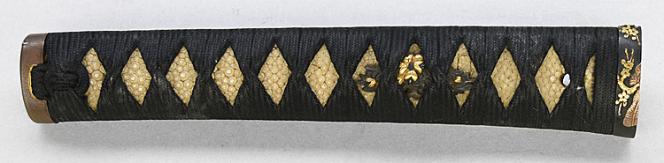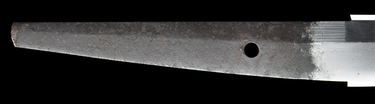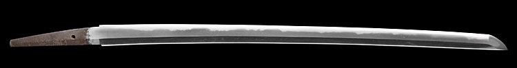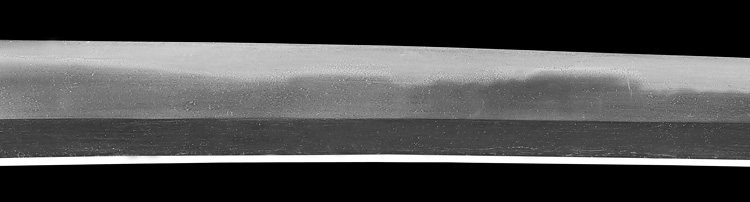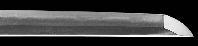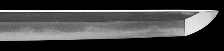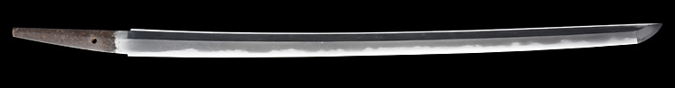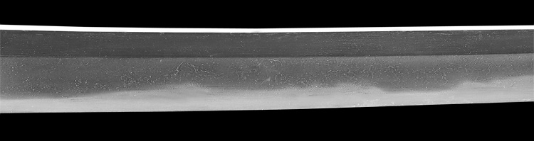 本造り庵棟 うぶ茎 小板目肌、杢交じりよく詰む。地沸微塵に厚くつき、細かな地景顕われ淡く沸映り立つ。刃紋は湾れに互の目、丁字、尖り刃交じる。匂い口フックラと小沸よくつく。沸足、葉盛んに働き、金筋、砂流しかかる。匂い口明るく冴える。本名は中川三九郎。包保一派。業物。黒呂塗千段刻鞘打刀拵(尾張拵)付き。(特別保存刀剣)