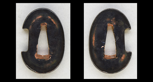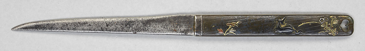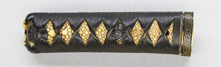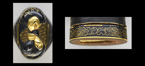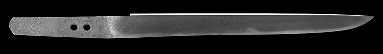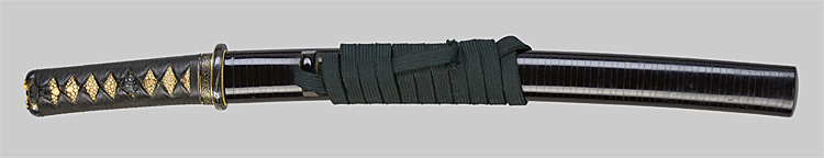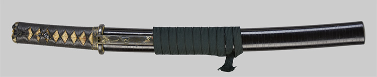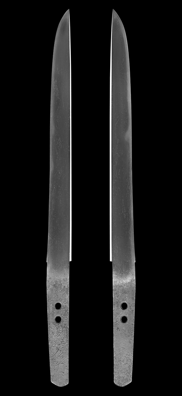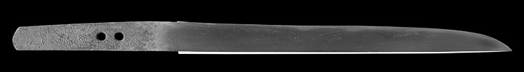 平造り庵棟 うぶ茎 小板目肌、柾交じりよく詰む。地沸微塵につき、細かな地景顕われ、淡く白気映り立つ。刃紋は湾れに互の目交じる。匂い深めに沸、小沸よくつく。湯走り、喰い違い刃かかり、葉働く。金筋、砂流しよくかかり、明るく冴える。関の北郊、上有知に住す美濃鍛冶。業物。黒笛巻鞘小刀拵付き。(保存刀剣)