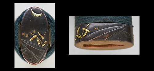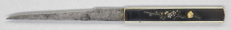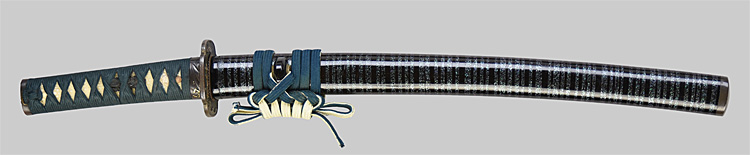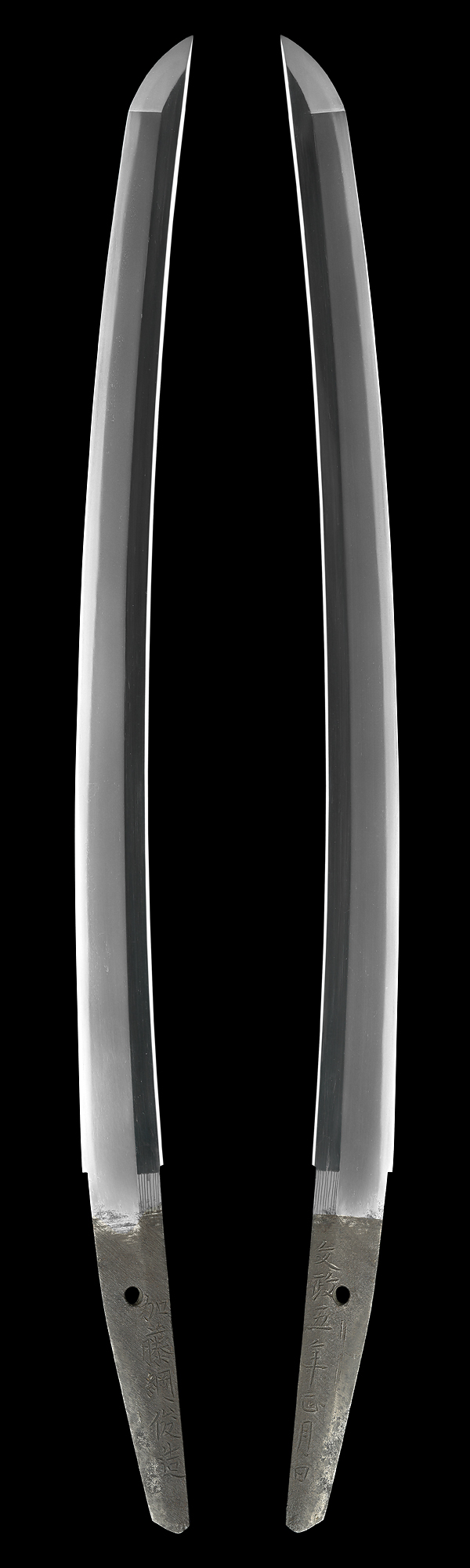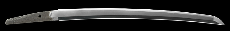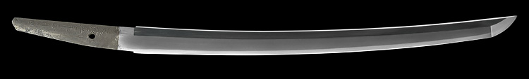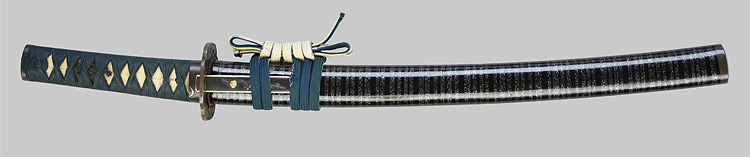 本造り庵棟 うぶ茎 小板目肌、柾交じりよく詰む。地沸微塵に厚くつき、細かな地景顕われ、淡く沸映り立つ。刃紋は中直刃、浅く湾れて小乱れ交じる。匂い口深めに小沸よくつく。刃縁ほつれ、喰い違い刃かかり、僅かに小足入り、葉働く。砂流しかかり匂い口明るく冴える。本名は加藤八郎。生国米沢。加藤國秀の子。綱英の弟。江戸麻布上杉藩邸にて鍛刀。晩年長寿斎と改める。水心子征秀門。青貝微塵塗黒笛巻鞘脇差拵付き。(特別保存刀剣)