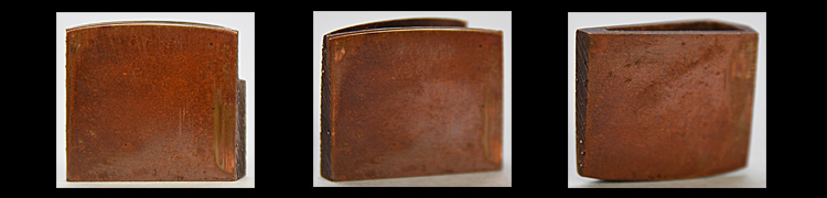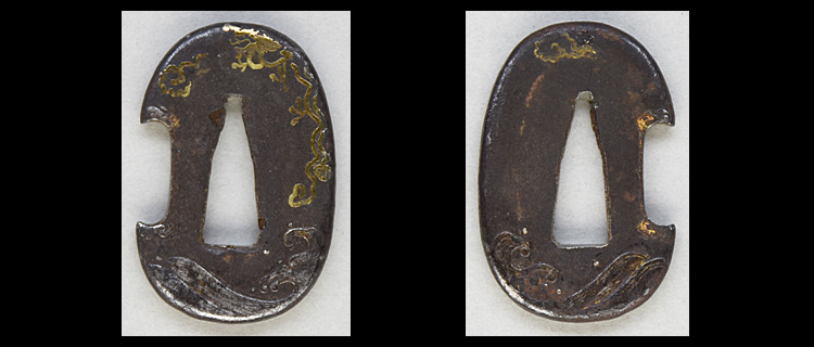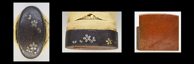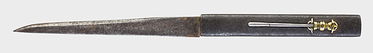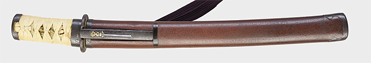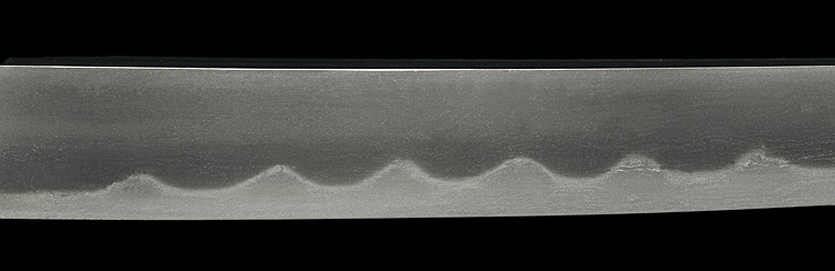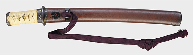 平造り庵棟 うぶ茎 小板目肌、柾交じりよく詰む。地沸微塵につき、細かな地景顕われ、淡く映り立つ。刃紋は互の目乱れ、尖り心の刃交じる。匂い口ややフックラと小沸よくつく。僅かに小足、葉働き、刃中頻りに金筋、砂流しかかる。匂い口明るく冴える。本名は斎藤礼太郎。金澤住。本国近江、甲斐、江戸、京でも打つ。茶石目塗家紋蒔絵鞘小刀拵付き。(保存刀剣)