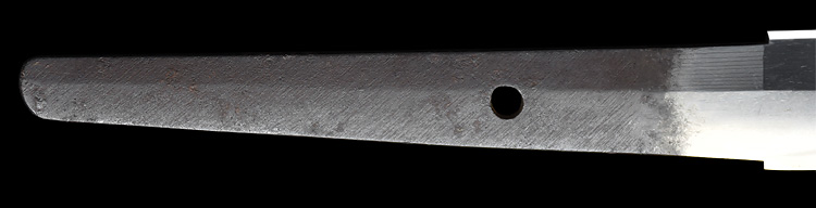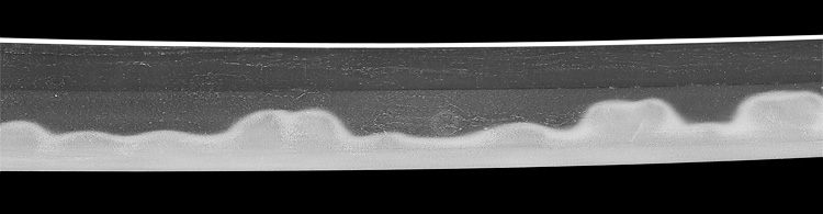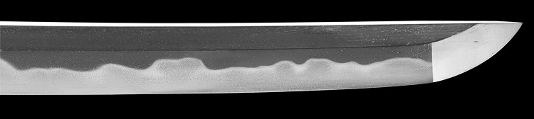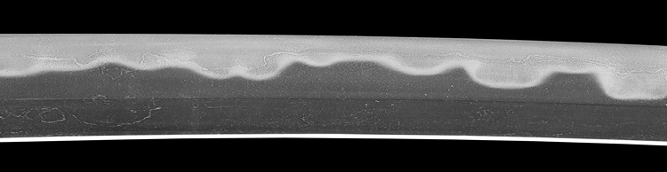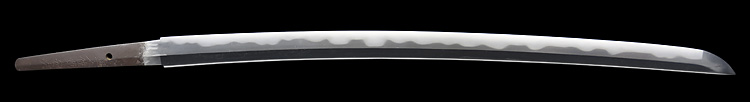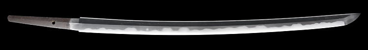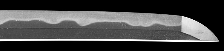 本造り庵棟 うぶ茎 小板目肌、杢交じりよく詰む。地沸微塵に厚くつき、細かな地景よく入り、淡く沸映り立つ。刃紋は湾れに互の目、丁字交じり、濤乱風に乱れる。匂い口フックラと小沸よくつく。飛び焼きかかり、沸足、葉盛んに働く。金筋、砂流し頻りにかかり、匂い口明るく冴える。藤島氏。大和守安定の門。江戸にても打つ。(特別保存刀剣)