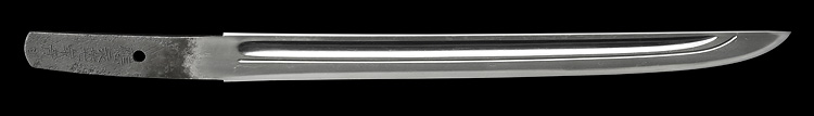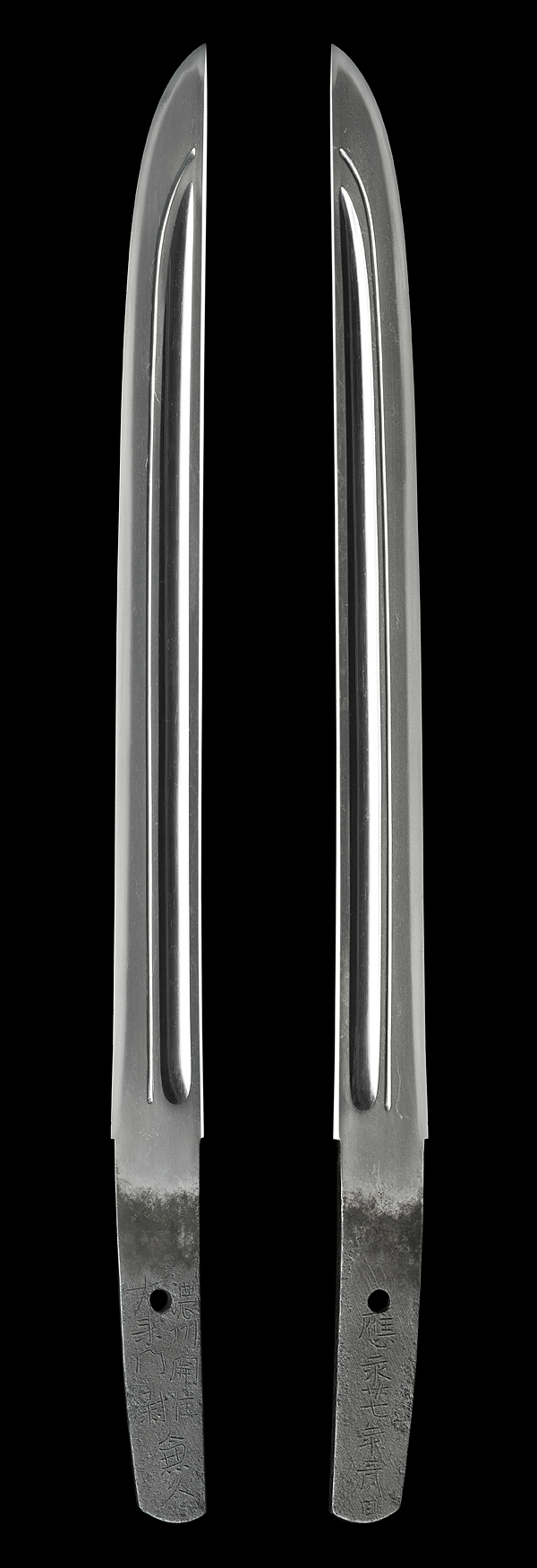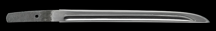 平造り三ツ棟 うぶ茎 小板目肌、柾交じりよく練れ詰む。(地鉄精美) 地沸微塵に厚くつき、細かな地景よく入り、棒状の映りに白気移り鮮明に立つ。刃紋は中直刃、浅く湾れて小乱れ交じる。匂い口締まり心に小沸よくつく。刃縁ほつれ、喰い違い刃、二重刃かかる。刃中葉働き、金筋、砂流しかかる。匂い口明るく見事に冴える。表裏に棒樋に添樋の彫刻。本名は太郎左衛門、のちに六郎左衛門。法名道阿。直江志津兼俊の門。初め直江で鍛刀、のち関に移住。兼久の養子の兼安は得印派の祖。(特別保存刀剣)