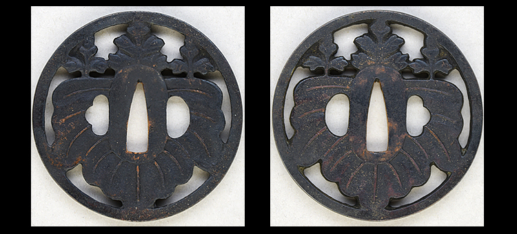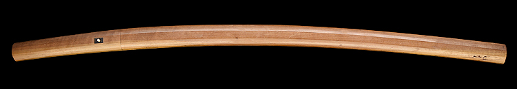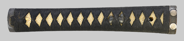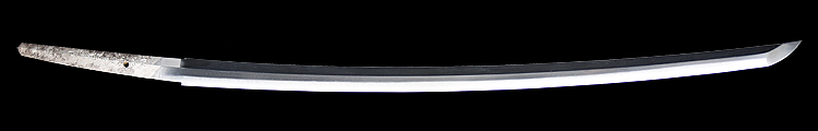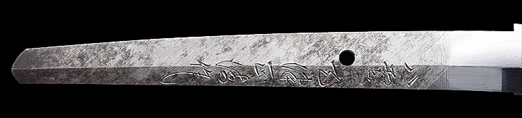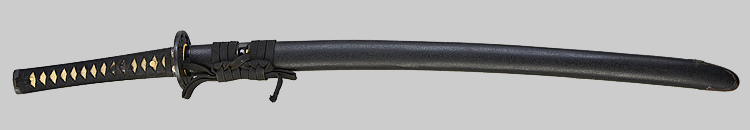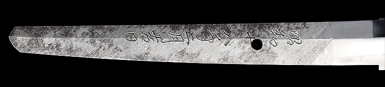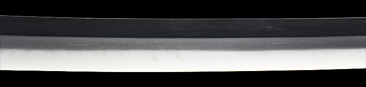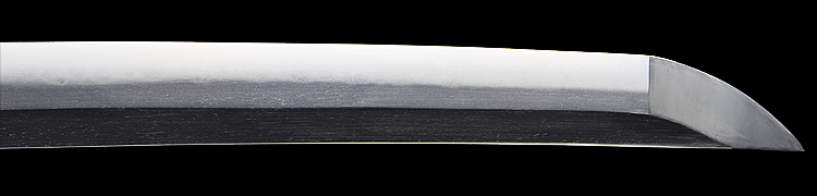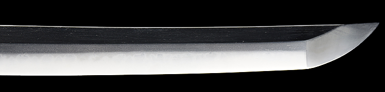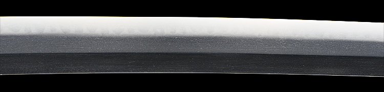 本造り庵棟 うぶ茎 小板目肌、杢交じりよく詰む。地沸微塵につき、細かな地景顕われ、淡く沸映り立つ。刃紋は互の目丁字乱れ、小丁字、尖り心の刃交じる。匂い口ややフックラと小沸よくつく。匂い足、葉盛んに働き、金筋、砂流しかかる。匂い口明るく冴える。本名は天津富太。元陸軍受命刀匠。陸軍軍刀技術奨励会会長賞。黑石目塗鞘突兵拵付き。