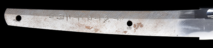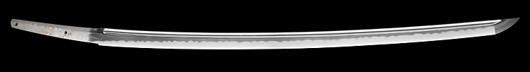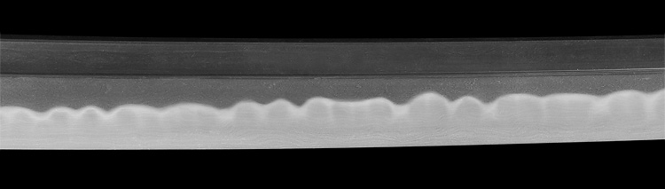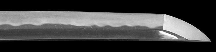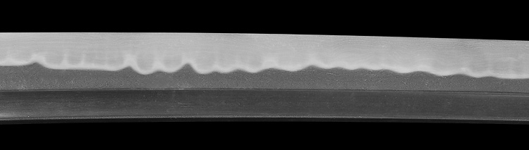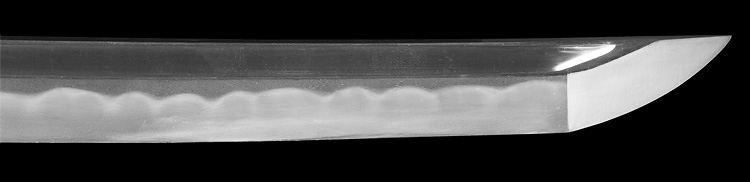 本造り庵棟 うぶ茎 小板目肌、杢交じりよく練れ詰む。地沸微塵に厚くつき、細かな地景顕われ、淡く映り立つ。刃紋は互の目乱れ、丁字交じる。匂い口フックラと小沸よくつく。匂い足盛んに入り、葉働く。金筋、砂流し頻りにかかり、匂い口明るく冴える。表裏に棒樋の彫刻。本名は森國利文。宮入清平、宮入法廣の門人。隅谷正峯にも習う。高松宮賞受賞刀匠。