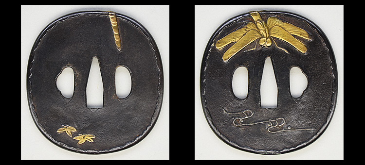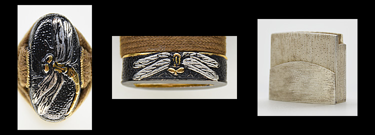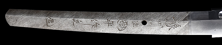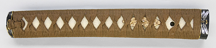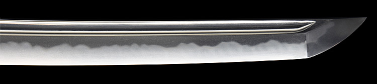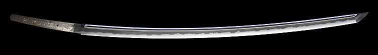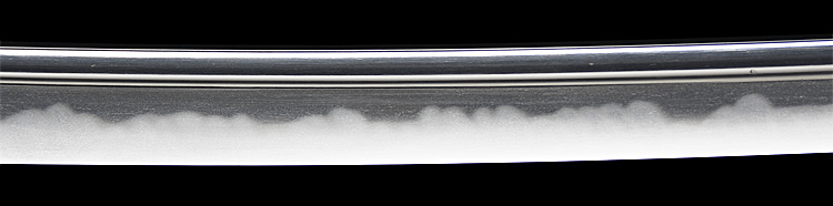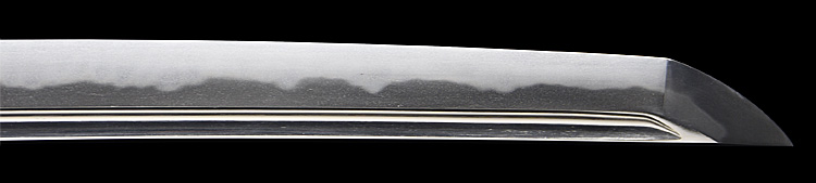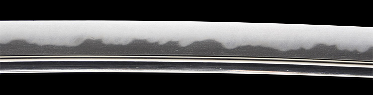 本造り庵棟 うぶ茎 小板目肌、杢交じりよく練れ詰む。地沸微塵に厚くつき、細かな地景よく入り淡く映り立つ。刃紋は互の目丁字乱れ、小丁字、尖り心の刃交じる。匂い口フックラと小沸よくつく。匂い足長く盛んに入り、葉働く。金筋、砂流し頻りにかかり、匂い口明るく冴える。表裏に棒樋の彫刻。大内勇。高橋義宗門。焦茶黒散塗鞘打刀拵付き。