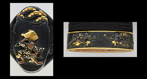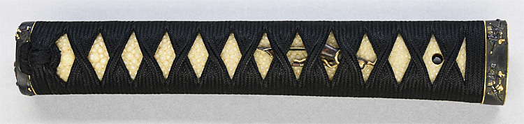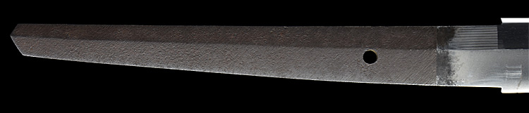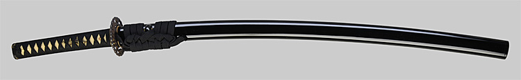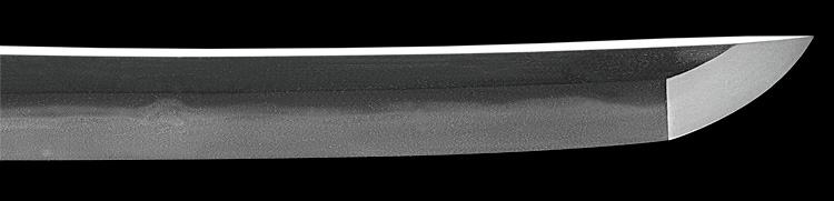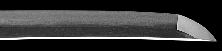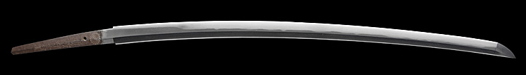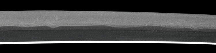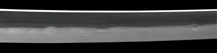 本造り庵棟 うぶ茎 小板目肌、小杢目交じりよく詰む。地沸微塵に厚くつき、細かな地景顕われ、淡く沸映り立つ。刃紋は湾れに互の目交じる。二重刃、三重刃かかり簾状に乱れる。沸足、葉盛んに働き、金筋、砂流し頻りにかかる。匂い口明るく冴える。簾刃見事。京丹波四代目。本名は三品吉之丞。三品一派。業物。黒呂塗鞘打刀拵付き。(特別保存刀剣)
