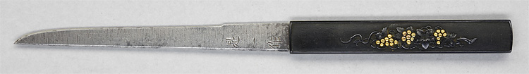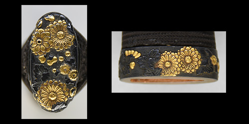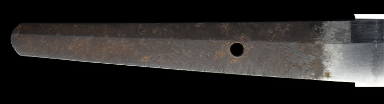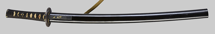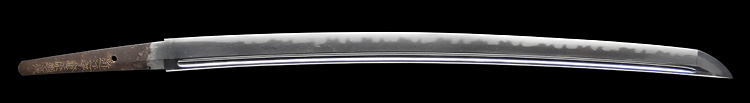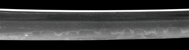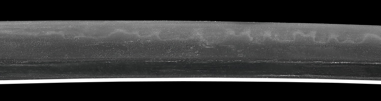 本造り庵棟 うぶ茎 小板目肌、杢交じりよく詰む。地沸微塵に厚くつき、細かな地景顕われ、淡く沸映り立つ。刃紋は互の目乱れ、丁字、尖り心の刃交じる。匂い口フックラと小沸よくつく。匂い足、葉働き、金筋、砂流しかかる。匂い口明るくよく冴える。表裏に棒樋の彫刻。一法子と号す。伊勢吉広同人。黒呂塗鞘脇差拵付き。(特別保存刀剣)