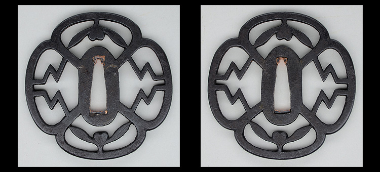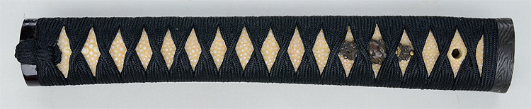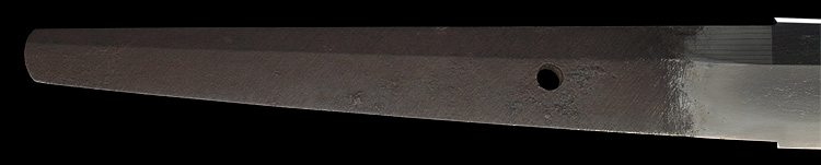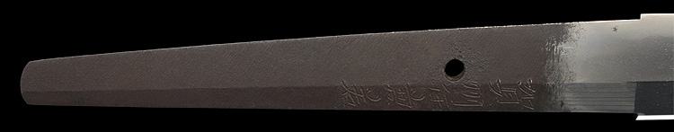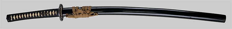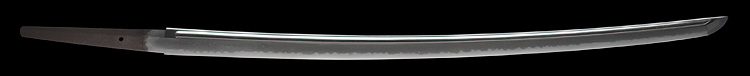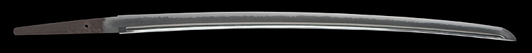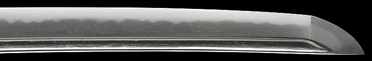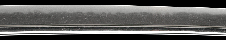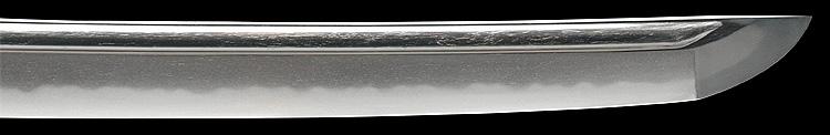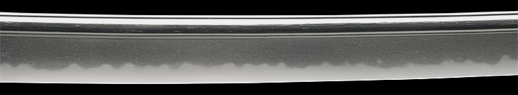 本造り庵棟 うぶ茎 板目肌、杢交じりよく練れよく詰む。地沸微塵に厚くつき、細かな地景よく入り、淡く映り立つ。刃紋は湾れに尖り互の目交じる。匂い口フックラと小沸よくつく。湯走りかかり小足、葉よく働く。砂流しかかり匂い口明るく冴える。表裏に棒樋の彫刻。本名辻村又助。初代兼若三男。長兄の景平の養子となり、二代兼若を襲名。業物。黒呂塗鞘打刀拵付き。(特別保存刀剣)