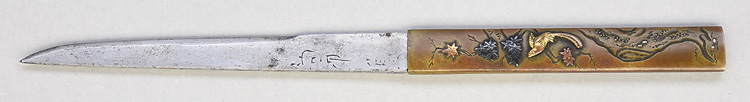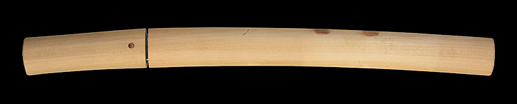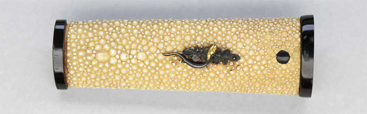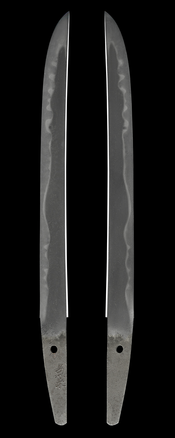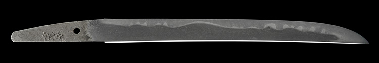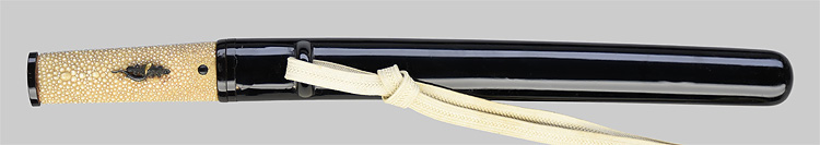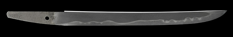 平造り庵棟 うぶ茎 板目肌、柾交じり、やや肌立ちよく詰む。地沸微塵に厚くつき、細かな地景顕われ淡く白気映り立つ。刃紋は湾れに互の目、丁字、尖り心の刃交じる。匂い口フックラと小沸よくつく。飛び焼きかかり匂い足、葉働く。金筋、砂流しかかり、匂い口明るく冴える。末関。出鮫黒呂塗鞘合口拵付き。(特別保存刀剣)