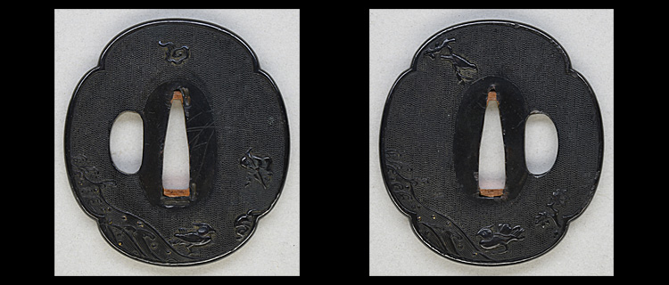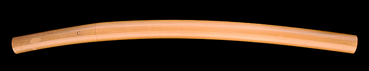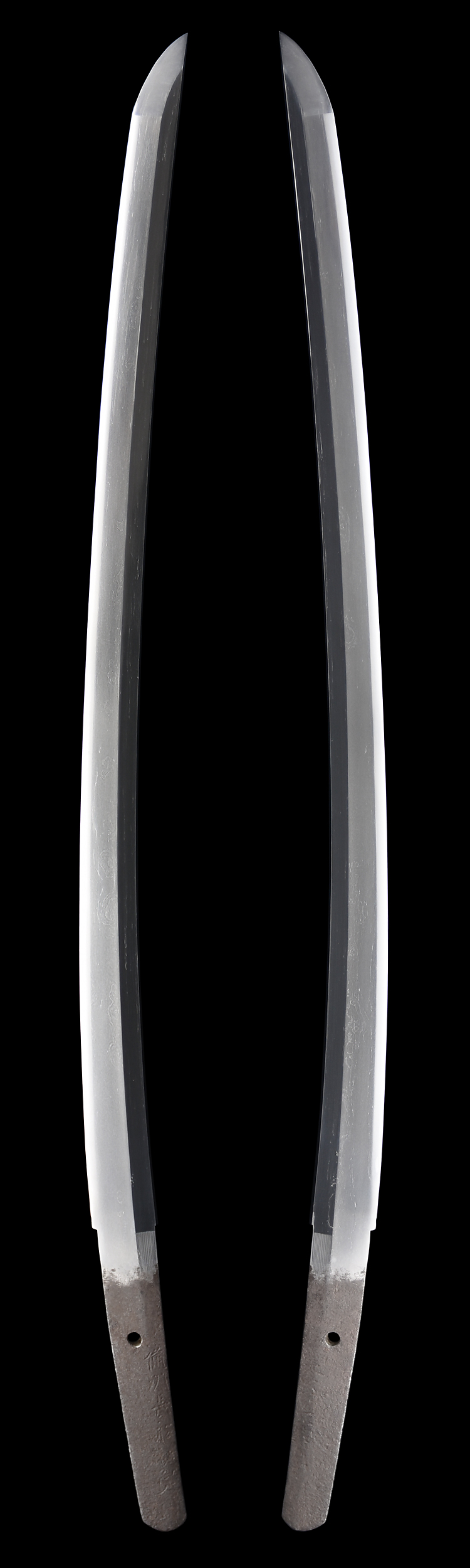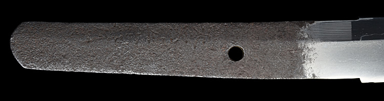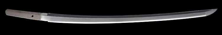 本造り庵棟 うぶ茎 板目肌、杢交じりやや肌立ち詰む。地沸微塵につき、細かな地景顕われ、焼出し映り立つ。刃紋は中直刃浅く湾れて小乱れ交じる。匂い口ややフックラと小沸つく。僅かに小足、葉働く。金筋、砂流しかかり、明るく冴える。地鉄も美しく出来も良いのですが再刃と思われます。良い拵えも付いて居合試斬には最適です。黒笛巻塗鞘脇差拵付き。