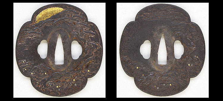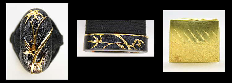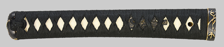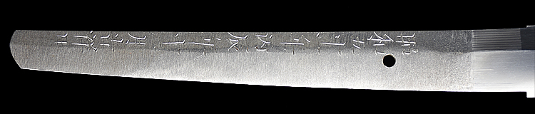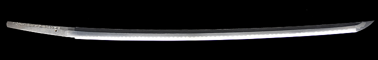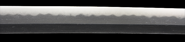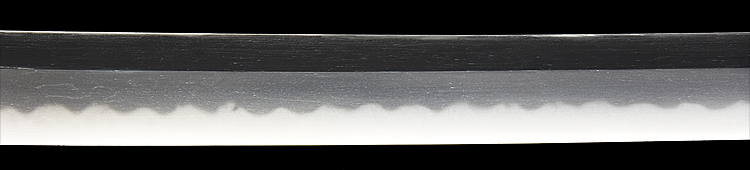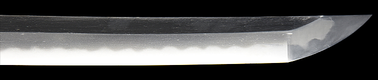 本造り庵棟 うぶ茎 小板目肌、柾交じりよく詰む。地沸微塵につき、細かな地景顕われ、淡く沸映り立つ。刃紋は湾れに互の目、丁字、尖り刃交じる。匂い口ややフックラと小沸よくつく。匂い足盛んに入り、葉働く。金筋、砂流しかかり、匂い口明るく冴える。本名は高野賢一。黒呂塗鞘打刀拵入り。