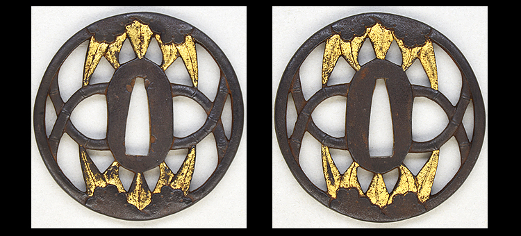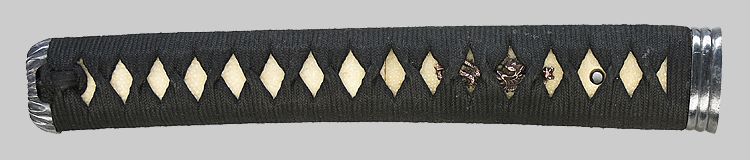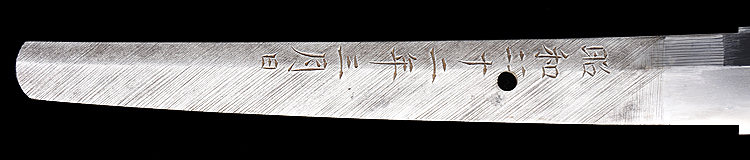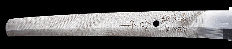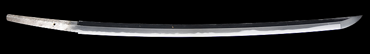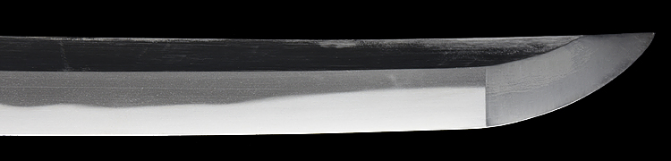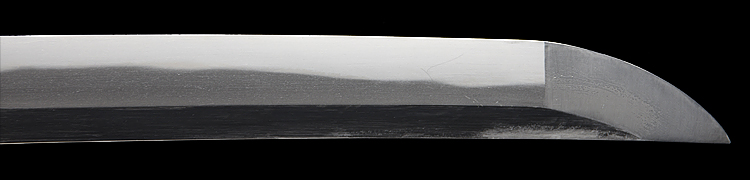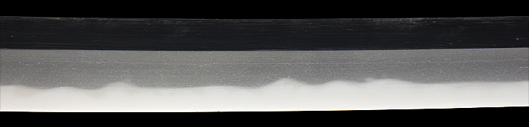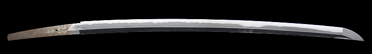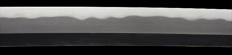 本造り庵棟 うぶ茎 小板目肌、杢交じりよく詰む。地沸微塵につき、細かな地景顕われ淡く白気映り立つ。刃紋は互の目乱れ、尖り刃交じる。匂い口ややフックラと沸、小沸よくつく。湯走りかかり、沸足、葉働く。金筋、砂流しかかり、明るく冴える。本名は脇中芳男。喜多弘。月山貞勝の門。広島県無形文化財。入賞多数。黒呂塗鞘打刀拵入り。