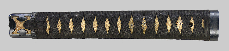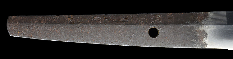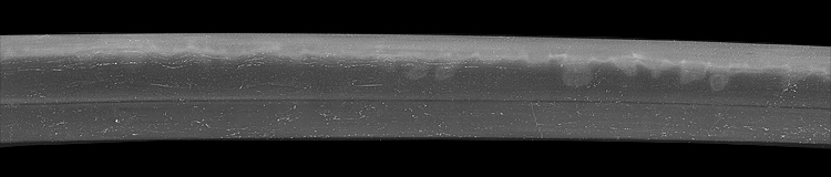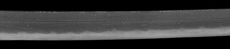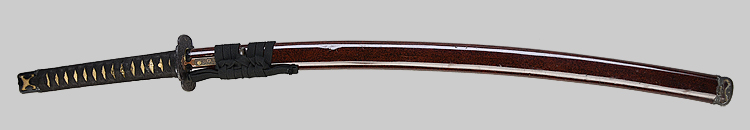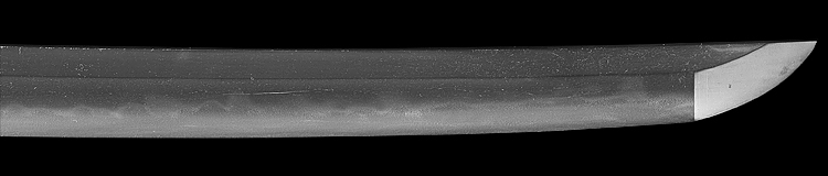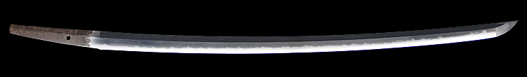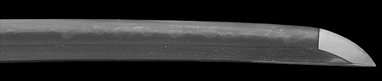 本造り庵棟 うぶ茎 小板目肌、柾交じりよく詰む。地沸微塵に厚くつき、細かな地景顕われ、淡く乱れ映り立つ。刃紋は湾れに小互の目、小丁字、尖り刃交じる。匂い口フックラと小沸よくつく。匂い足、葉盛んに働き、金筋、砂流しかかる。匂い口明るく冴える。本名は川上左近。生国江州蒲生郡石堂寺村。江戸石堂の祖。初銘是勝。備前一文字の流れを汲む。暗朱色塗鞘打刀拵付き。 (特別保存刀剣)