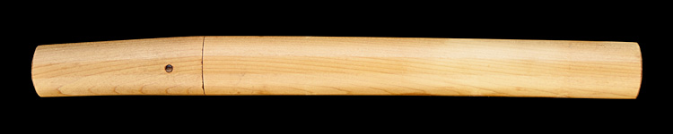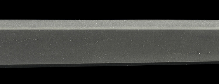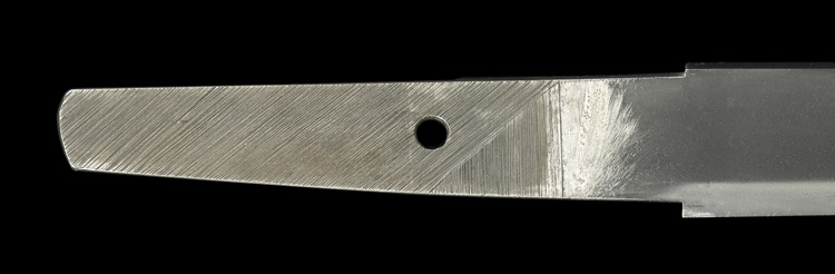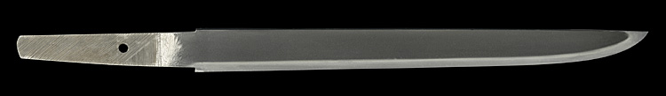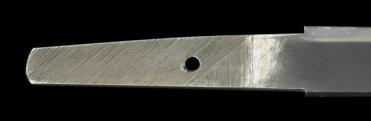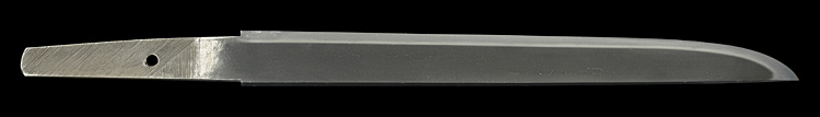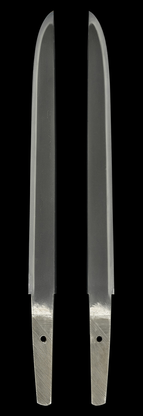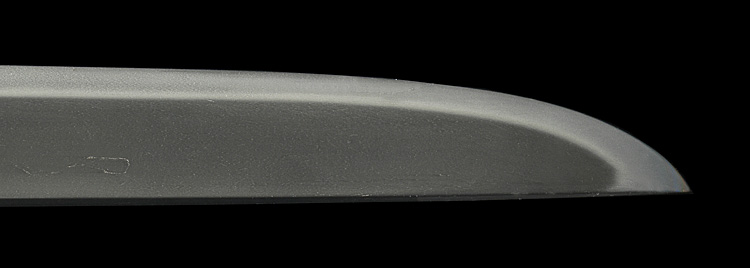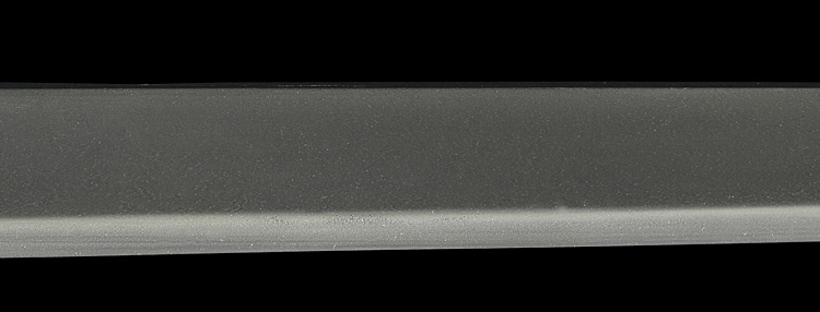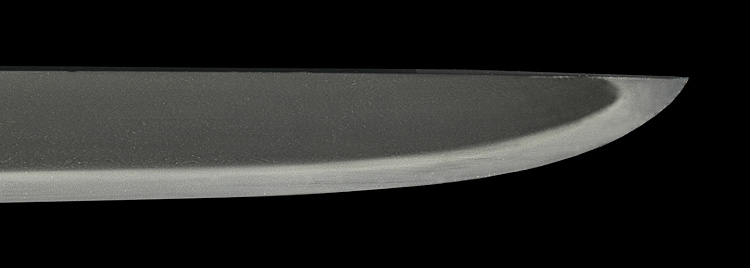 平造り庵棟 うぶ茎 小板目肌、柾交じりよく詰む。地沸微塵につき、細かな地景顕われ、淡く白気映り立つ。刃紋は中直刃、浅く湾れて、僅かに小乱れ交じる。匂い口フックラと小沸よくつく。刃縁に細かな金筋よく絡み、明るく冴える。本名は大束周次。元陸軍受命刀匠。陸軍軍刀技術奨励会入選。國工院会員名誉宗匠。堀井俊秀の門。(特別貴重刀剣)