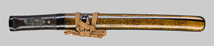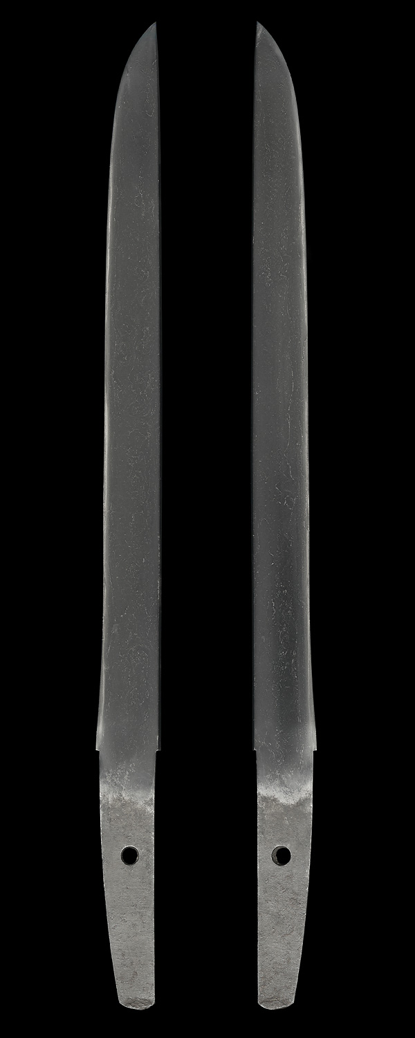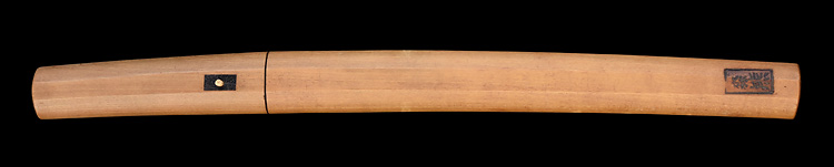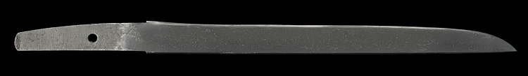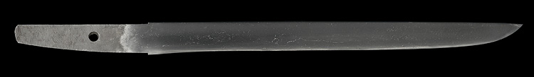 平造り庵棟 うぶ茎 板目肌、杢交じりよく練れ詰む。地沸微塵につき、細かな地景顕われ白気映り立つ。刃紋は細直刃、浅く湾れて小乱れ交じる。匂い口ややフックラと小沸よくつく。刃縁ほつれ、喰い違い刃かかる。刃縁に金筋よく絡み、砂流しかかり明るく冴える。末古刀備後三原派。(保存刀剣)