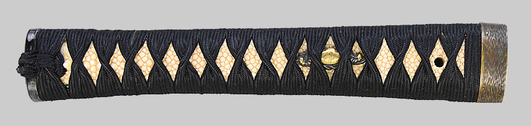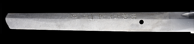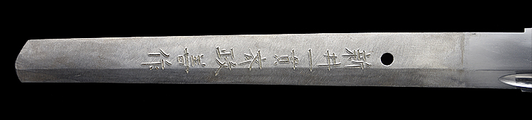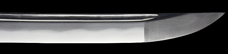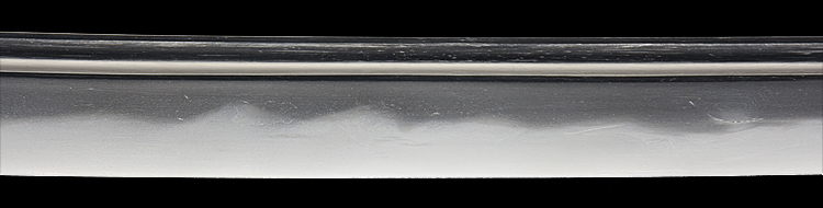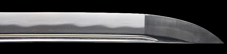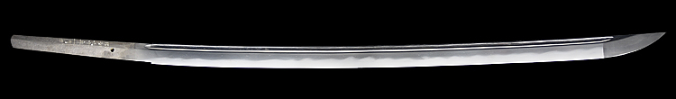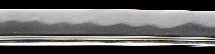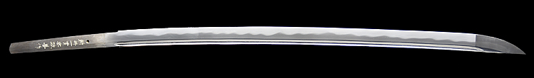 本造り庵棟、うぶ茎 小板目肌杢交じりよく詰む。地沸微塵につき、細かな地景顕われ淡く沸映り立つ。刃紋は湾れに互の目、尖り刃交じる。匂い口ややフックラと小沸よくつく。湯走り、飛び焼きかかり小足、葉盛んに働く。金筋、砂流しかかり匂い口明るく冴える。表裏に棒樋の彫刻。本名は新井善一。酒井一貫斉繁政の門。元幅3.36㎝先幅2.99㎝、大切先の豪刀です。黒呂塗鞘打刀拵付き。