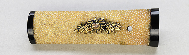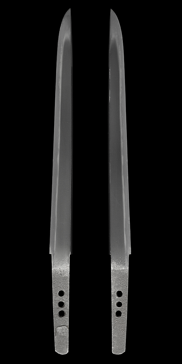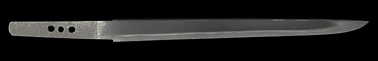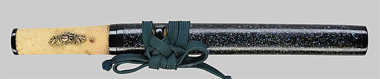 平造り庵棟 うぶ茎 小板目肌よく詰み、地沸微塵につく。細かな地景顕われ、淡く沸映り立つ。刃紋は中直刃、浅く湾れて小乱れ交じる。匂い口ややフックラと小沸つく。僅かに小足、葉働く。金筋、砂流しかかり、明るく冴える。羽山浄六郎。羽山円真の六男。出鮫青貝散塗鞘合口拵入り。(刀剣保存会)