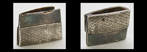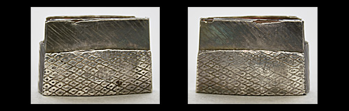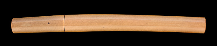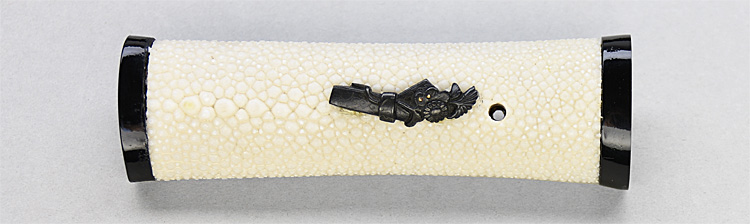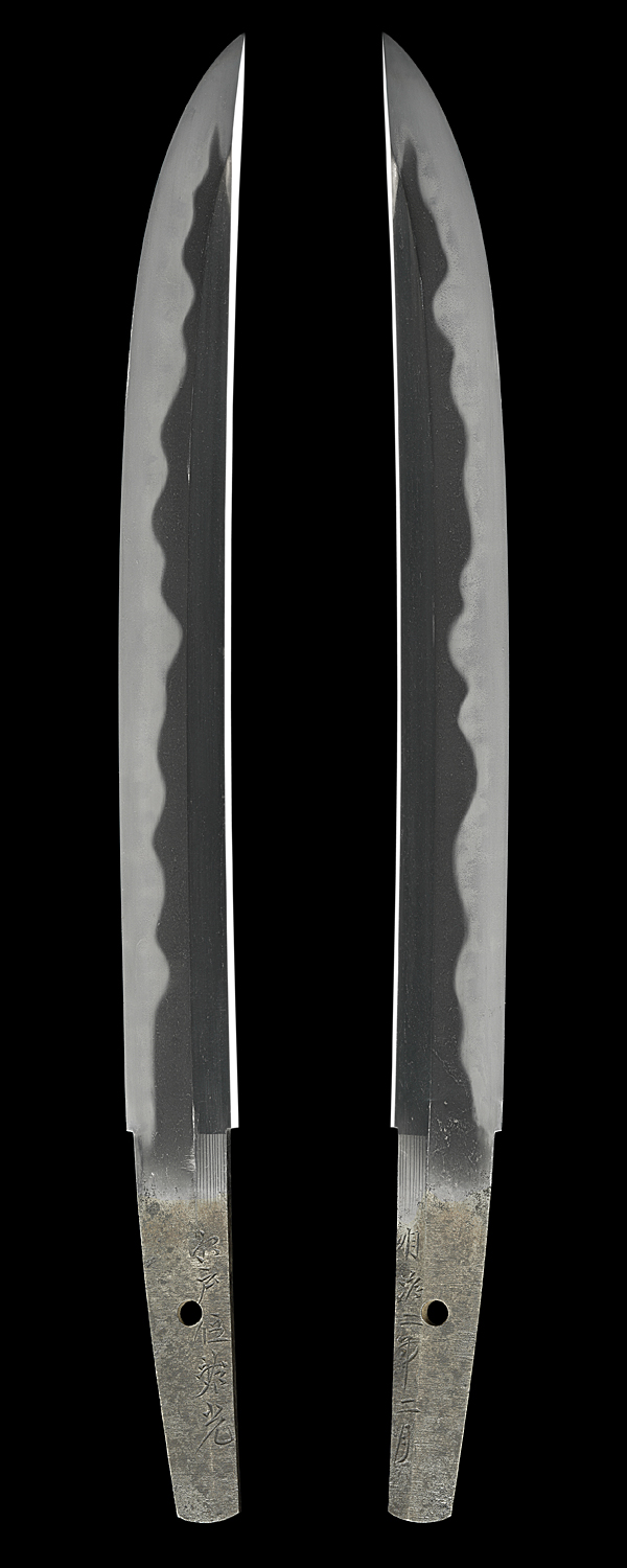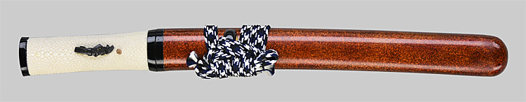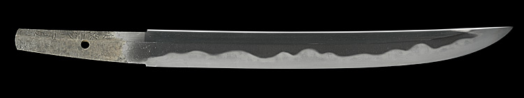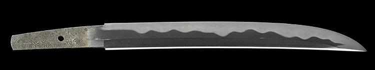 冠落し造り庵棟 うぶ茎 小板目肌、杢交じりよく詰む。地沸微塵に厚くつき、細かな地景顕われ、淡く沸映り立つ。刃紋は互の目、丁字乱れ、尖り刃交じる。匂い深めによく沸づく。湯走り、飛び焼きかかり、沸足、葉、盛んに働く。金筋、砂流し頻りにかかり、匂い口明るく冴える。本名は横山喜十郎。本国備前。水戸藩工。出鮫金散塗鞘合口拵付き。(特別保存刀剣)
