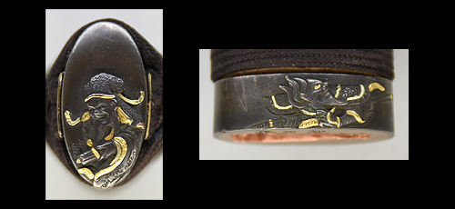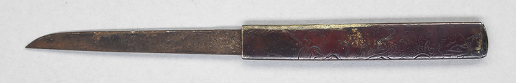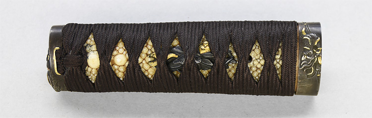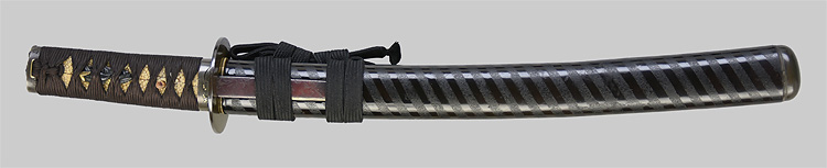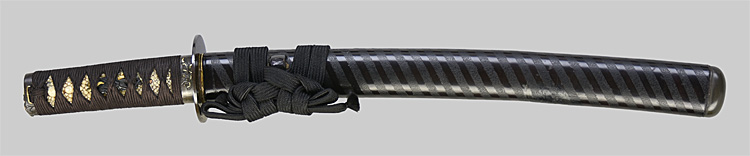 平造り庵棟 うぶ茎 板目肌、杢交じり、ザングリと肌立ち、よく練れ詰む。地沸微塵に厚くつき、細かな地景よく入り、淡く乱れ映り立つ。刃紋は広直刃、浅く湾れて小乱れ交じる。匂い口、締まり心に小沸よくつく。湯走りかかり、小足、葉盛んに働く。金筋、砂流しかかり、匂い口明るく冴える。清光特有の牛のよだれと呼ばれる所作があります。黒石目塗蛭巻鞘小刀拵付き。(特別保存刀剣)