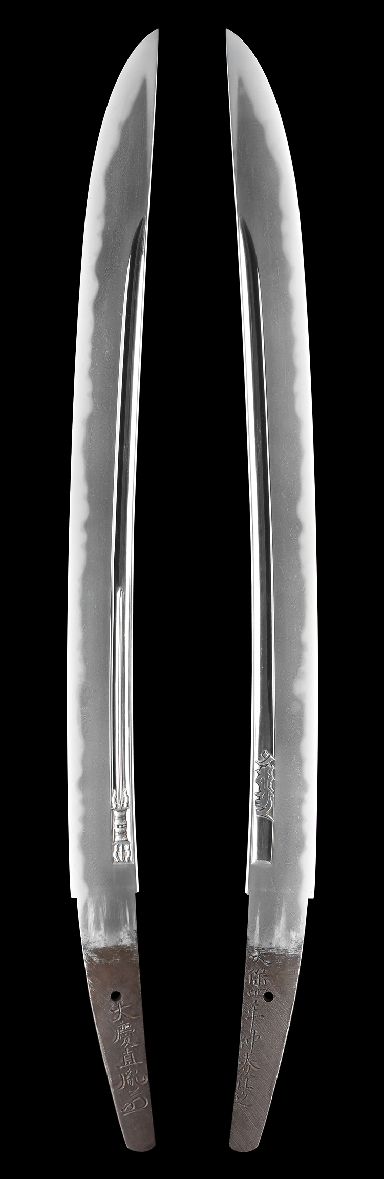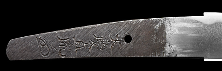 平造り三ツ棟 うぶ茎 板目肌、大板目、杢交じりよく練れ詰む。地沸微塵に厚くつき、細かな地景よく入り、淡く沸映り立つ。刃紋は互の目乱れ、片落ち互の目、丁字交じる。匂い口フックラと小沸よくつく。匂い足、葉盛んに働き、金筋、砂流し頻りにかかる。匂い口明るく見事に冴える。表に棒樋、樋内に三鈷剣、裏に棒樋、樋内に梵字の彫刻。(義胤彫)本名は荘司蓑兵衛。生国出羽國山形。水心子正秀門。秋元家抱工。新々刀最上作。(特別保存刀剣)