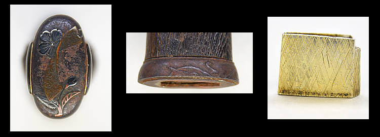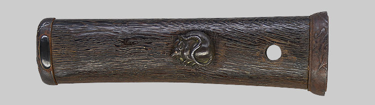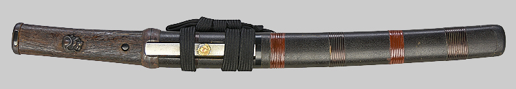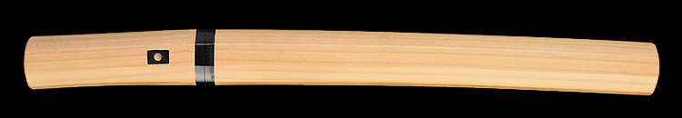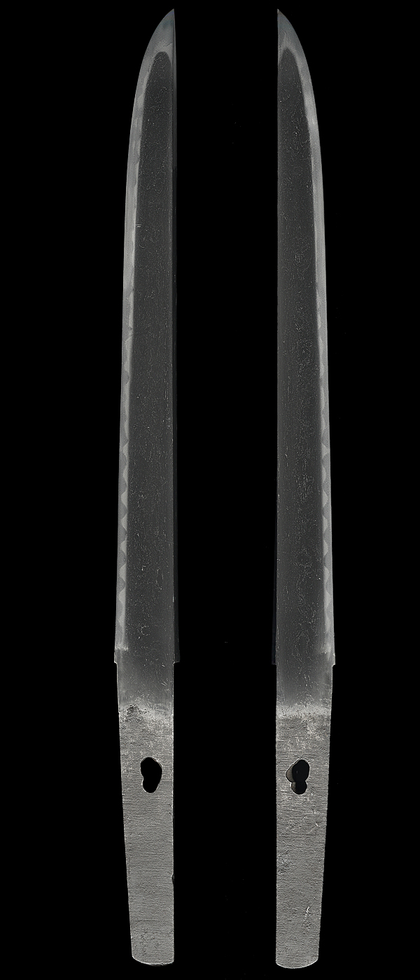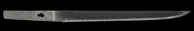 平造り庵棟 うぶ茎 板目肌、柾交じりザングリと肌立ちよく詰む。地沸つき、細かな地景顕われ、白気映り立つ。刃紋は互の目乱れ、尖り心の刃交じる。匂い口ややフックラと小沸よくつく。足、葉働き、金筋、砂流しかかり明るく冴える。末古刀の美濃物です。黒石目塗鞘堅木合口拵付き。(保存刀剣)