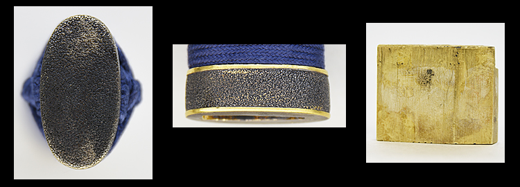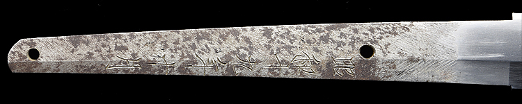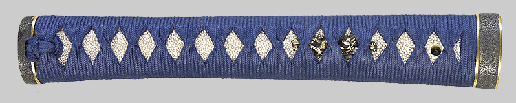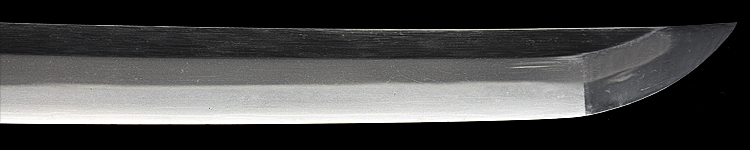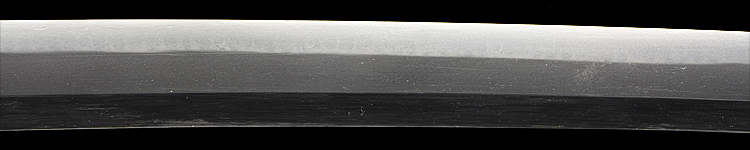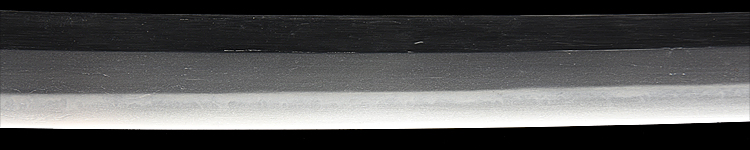 本造り庵棟 うぶ茎 小板目肌、柾交じりよく詰む。地沸微塵につき、細かな地景顕われ、淡く白気映り立つ。刃紋は広直調子、小互の目、小丁字交じる。匂い口締まり心に小沸つく。小足盛んに入り、葉働く。金筋、流しかかり、匂い口沈み心に冴える。本名は武山勲。元陸軍受命刀匠。陸軍軍刀技術奨励会入選。黒呂塗鞘打刀拵入り。