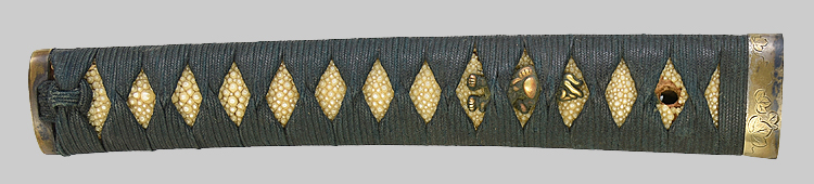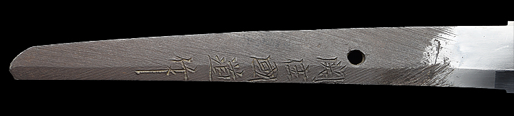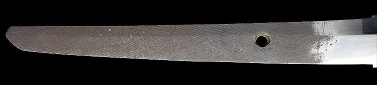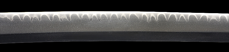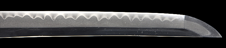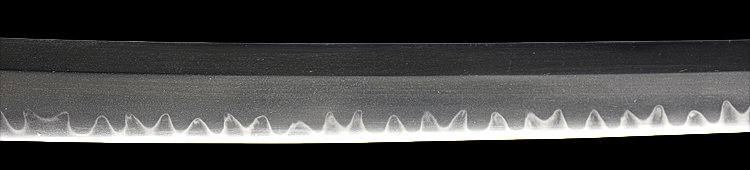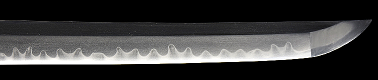 本造り庵棟 うぶ茎 小板目肌、杢交じりよく詰む。地沸微塵につき、細かな地景顕われ、淡く映り立つ。刃紋は尖り互の目乱れ、丁字交じる。匂い口ややフックラと小沸よくつく。匂い足、葉働き、金筋、砂流しかかる。匂い口明るく冴える。関の軍刀鍛冶、戦後の作刀を見ない。暗朱色塗鞘打刀拵入り。
