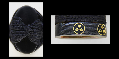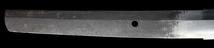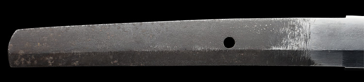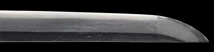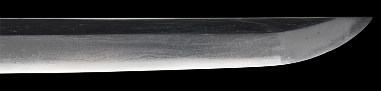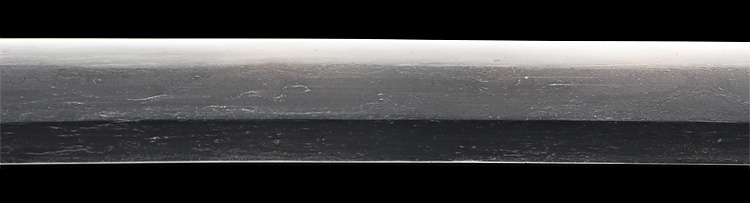 本造り庵棟 うぶ茎 板目肌、杢交じりやや大肌顕われ詰む。地沸微塵につき、細かな地景顕われ、白気映り立つ。刃紋は湾れに互の目交じる。匂い口やや深めに、沸、小沸つく。湯走りかかり、僅かに小足、葉働く。金筋、砂流しかかり明るく冴える。重ね厚くガッシリとsた海部刀です。黒呂塗鞘打刀拵付き。