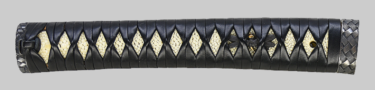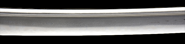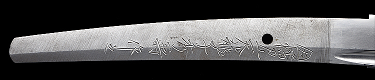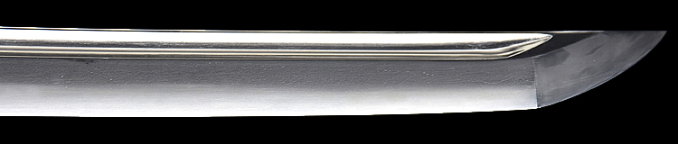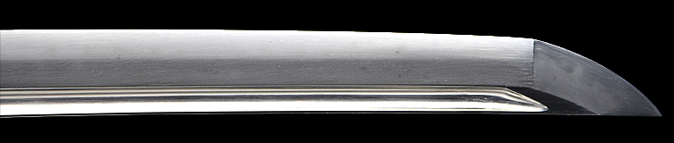本造り庵棟 うぶ茎 小板目肌、柾交じりよく詰む。地沸微塵につき、細かな地景顕われ淡く沸映り立つ。刃紋は互の目乱れ、丁字交じる。匂い口やや深めに沸、小沸よくつく。湯走りかかり、沸足、葉盛んに働く。金筋、砂流し頻りにかかり、明るく冴える。表裏に棒樋の彫刻。本名は金埼秀寿。父天日斎助寿の門。黒呂塗鞘打刀拵付き。